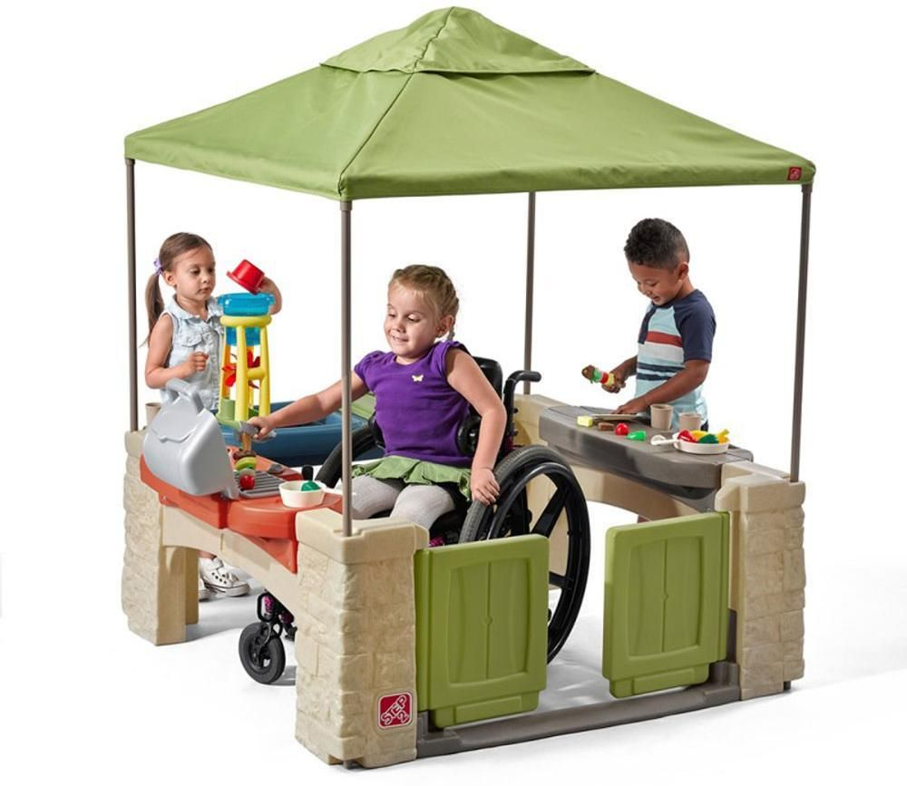 Avoin leikkimökki puutarhaan perheen pienimmille. Katos, jotta lapset voivat leikkiä varjossa auringon porottaessa. Vietä monta tuntia hauskaa leikkiessä kokkia, ravintolaa tai kahvilaa. Keittiössä grilli ja pesuallas, joten lapset voivat grillata suosikkiaterioitaan.