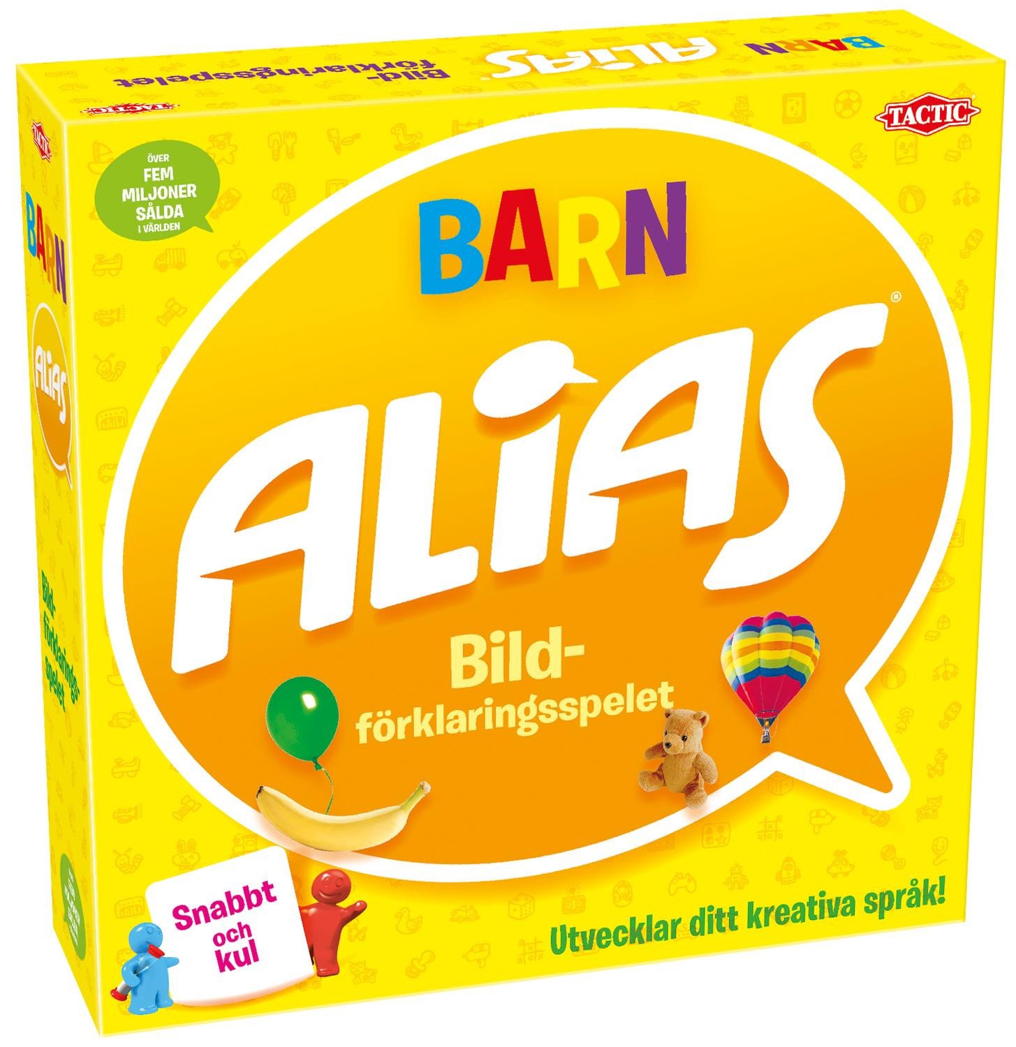 Barn Alias är ett roligt ordförklaringsspel för barn där man ska förklara ord och bilder för dina lagkamrater utan att säga det ord som bilden föreställer. Du får använda synonymer, motsatser, ledtrådar och ljud. Eftersom det finns bilder på orden som ska förklaras kan även mindre barn som inte hunnit lära sig läsa spela spelet. Det gäller för laget att hinna lista ut så många ord de kan innan sanden rinner ner i timglaset.