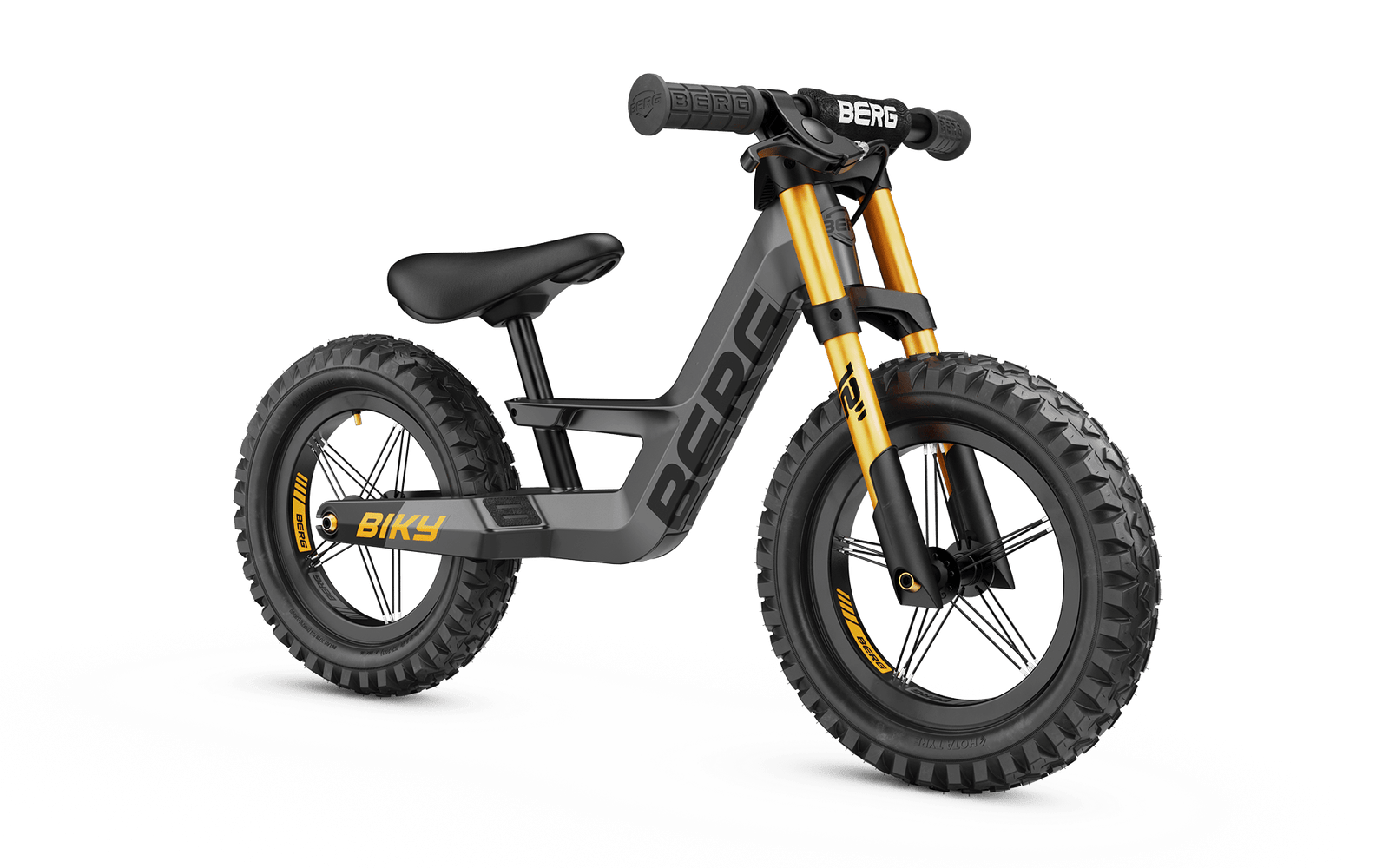 Halusitpa tutkia kaupunkia tai etsiä vähän rouheampaa maastoa, BERG Biky on valmis seikkailuun. Kuten muutkin BERG Biky -perheen mallit, tässä potkupyörässä on ultrakevyt runko, turvallinen ohjauksen rajoitin, säädettävä satula ja mukavat ilmakumirenkaat. Tämä tekee tästä siististä potkupyörästä täydellisen kumppanin jokaiseen seikkailuun. Oletko sinäkin valmis? Nopea ja helppo kasaus • BERG Biky Cross on kasattavissa hetkessä. • Työkalut toimitetaan mukana. Perusta: runko • Sopii noin 90–120 cm pituisille lapsille (2–5 vuotta). • Palkittu muotoilu. • Erittäin vahva ja kevyt runko. Kokonaispaino vain 4 kiloa. • Yhdestä osasta valmistettu runko tekee potkupyörästä äärimmäisen kestävän ja tyylikkään näköisen. • Kaksoisjauhemaalattu, joka antaa entistä pidemmän käyttöiän. • Non-slip jalkatuet, joille voi lepuuttaa jalkoja ajon aikana. • Integroitu satulakiinnike. • Potkupyörää on helppo kantaa usealla eri tavalla. Design • Siisti maastopyörä-look. • Alumiiniset vanteet • Alumiininen etuhaarukka. Mukava istuin • Mukava, pehmeä nahkainen satula. • Portaattomasti säädettävä satulakorkeus – säädä satula juuri haluamallesi korkeudelle. Ohjaustanko • Ohjaustangon päiden suojaus – ohjausputki ei vaurioidu, jos potkupyörä kaatuu ohjaustangon päälle. • Siisti ja turvallinen ohjaustankotyyny. • Mukavat, pitävät kädensijat. • Ohjauksen rajoitin: lapsen taitotason mukaan voit säätää rajoitinta kahteen eri asentoon. Jarrut • Säädettävä ja ergonominen käsijarru. • Integroitu jarruvaijeri – paremmin piilossa ja turvallisempi. Renkaat • Mukavat ja kestävät ilmakumirenkaat. • Kumirenkaat, joissa on pitävä pintakuvio. Lisävarusteet • Turvallisuuden lisäämiseksi voit valita esimerkiksi BERG Biky -seisontatuen, BERG-kypärän S tai BERG Biky Turvalipun. • Kätevyyttä tuo kantohihna, jolla voit kuljettaa Biky-potkupyörää helposti mukana. • Personointi on myös mahdollista – tämän teet BERG Biky -numerokilvellä, jolloin voit esitellä kaikille oman nimesi ja kilpailunumerosi.