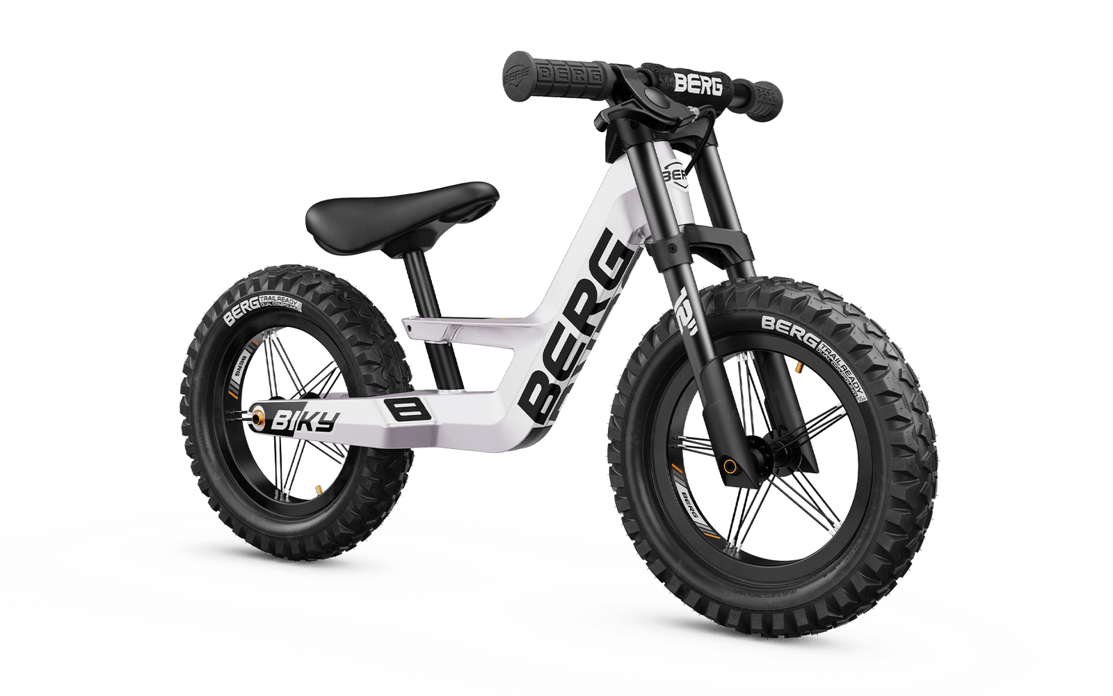 Halusitpa tutkia kaupunkia tai etsiä vähän rouheampaa maastoa, BERG Biky on valmis seikkailuun. Kuten muutkin BERG Biky -perheen mallit, tässä potkupyörässä on ultrakevyt runko, turvallinen ohjauksen rajoitin, säädettävä satula ja mukavat ilmakumirenkaat. Tämä tekee tästä siististä potkupyörästä täydellisen kumppanin jokaiseen seikkailuun. Oletko sinäkin valmis? Nopea ja helppo kasaus • BERG Biky Cross on kasattavissa hetkessä. • Työkalut toimitetaan mukana. Perusta: runko • Sopii noin 90–120 cm pituisille lapsille (2–5 vuotta). • Palkittu muotoilu. • Erittäin vahva ja kevyt runko. Kokonaispaino vain 4 kiloa. • Yhdestä osasta valmistettu runko tekee potkupyörästä äärimmäisen kestävän ja tyylikkään näköisen. • Kaksoisjauhemaalattu, joka antaa entistä pidemmän käyttöiän. • Non-slip jalkatuet, joille voi lepuuttaa jalkoja ajon aikana. • Integroitu satulakiinnike. • Potkupyörää on helppo kantaa usealla eri tavalla. Design • Siisti maastopyörä-look. • Alumiiniset vanteet • Alumiininen etuhaarukka. Mukava istuin • Mukava, pehmeä nahkainen satula. • Portaattomasti säädettävä satulakorkeus – säädä satula juuri haluamallesi korkeudelle. Ohjaustanko • Ohjaustangon päiden suojaus – ohjausputki ei vaurioidu, jos potkupyörä kaatuu ohjaustangon päälle. • Siisti ja turvallinen ohjaustankotyyny. • Mukavat, pitävät kädensijat. • Ohjauksen rajoitin: lapsen taitotason mukaan voit säätää rajoitinta kahteen eri asentoon. Jarrut • Säädettävä ja ergonominen käsijarru. • Integroitu jarruvaijeri – paremmin piilossa ja turvallisempi. Renkaat • Mukavat ja kestävät ilmakumirenkaat. • Kumirenkaat, joissa on pitävä pintakuvio. Lisävarusteet • Turvallisuuden lisäämiseksi voit valita esimerkiksi BERG Biky -seisontatuen, BERG-kypärän S tai BERG Biky Turvalipun. • Kätevyyttä tuo kantohihna, jolla voit kuljettaa Biky-potkupyörää helposti mukana. • Personointi on myös mahdollista – tämän teet BERG Biky -numerokilvellä, jolloin voit esitellä kaikille oman nimesi ja kilpailunumerosi.
