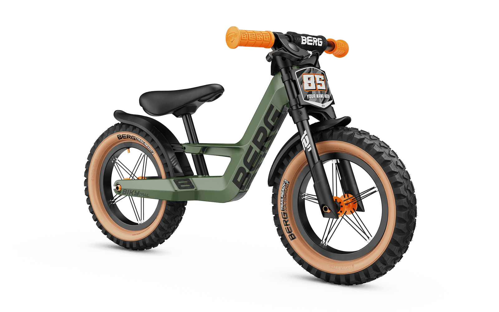BERG Biky Trail Green Handbrake on potkupyörä 2–5-vuotiaille lapsille, jotka ovat valmiita valitsemaan oman reittinsä. Haluatko tutustua kaupunkiin vai etsitkö mieluummin hieman haastavampaa maastoa? Tämä Biky on valmis seikkailuun. Siinä on näyttävä off-road-ulkonäkö, siistit lokasuojat, käsijarru ja personoitava kilpanumero. Kuten muutkin Biky-perheen mallit, myös tämä potkupyörä on valmistettu kevyestä magnesiumista, siinä on ohjauksen rajoitin, säädettävä satula ja mukavat ilmatäytteiset renkaat. Oletko valmis seikkailuun? Off-road-ulkonäkö Tämän Bikyn off-road-ilme tekee siitä ainutlaatuisen näköisen. Yksityiskohtia arvostava huomaa heti erottuvat 12 tuuman skinwall-renkaat. Jos katsot tarkkaan, huomaat myös oranssin etu- ja takanavan. Lisäksi Bikystä löytyy mukavat oranssit kädensijat, ohjaustangossa oleva pehmuste ja vahva tuplahaarukka edessä. Haarukka on valmistettu alumiinista, joten tämä Biky pysyy kevyenä. Jos vauhti on sinun juttusi, hallinta ja turvallisuus ovat tietenkin tärkeitä. Siksi voit luottaa käsijarruun, jonka ansiosta voit aina hidastaa vauhtia helposti silloin kun haluat. Lisävarusteet • Off-road-ulkoasu viimeistellään näyttävillä lokasuojilla. Näin et joudu jättämään ajamista väliin mudan tai huonon sään vuoksi. Nämä kestävät mustat lokasuojat ovat saatavilla myös erikseen ja ne sopivat muihinkin BERG Biky -malleihin. • Mukana tulevaan kilpanumeroon voit liimata oman nimesi ja kilpanumerosi. Käytä mukana tulevaa tarralevyä ja tee se helposti. Kun olet valmis, kiinnität kilpanumeron vaivattomasti ohjaustankoon – ja sitten olet valmis kisaan! Kevytrakenteisuuden voima BERG on hyödyntänyt uusimpia tuotantotekniikoita, jotta Biky-potkupyöristä saataisiin mahdollisimman kevyitä. Kaikissa Biky-malleissa on kevyt magnesiumrunko. Hyvän ergonomian ansiosta istut aina mukavasti. Biky kasvaa mukanasi! Matala runko ja korkeussäädettävä satula tekevät Bikystä sopivan 85–120 cm pitkille lapsille. Säädä Biky sinulle sopivalle korkeudelle, työnnä vauhtia ja aseta jalkasi liukuesteillä varustetuille astinlaudoille. Löydät tasapainon nopeasti ja pääset nauttimaan vapaudesta, jonka oma Biky tuo! Hallittu ohjaus ja jarrutus Bikylla ei ole vain hauska tutkia maailmaa, vaan se on myös täydellinen tapa harjoitella tasapainoa ja ohjaamista. Näin valmistaudut helposti opettelemaan ajamaan itsenäisesti polkupyörällä.