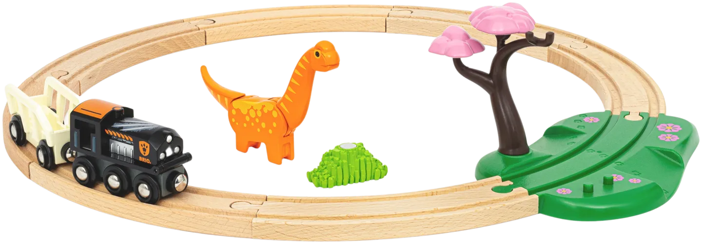 Rrrräyh — dinosaurus odottaa radalla! 36098 Dinosaurus ympyräratasetti vie leikit esihistoriallisiin seikkailuihin. Tässä 12-osaisessa setissä on juna vaunuineen, hurmaava dinosaurus, vihreä niittyristeys ja puiset raiteet ympyräradan rakentamiseen. Ole tarkkana risteyksessä, sillä dinosaurus napostelee mielellään lehtiä puusta! Dinosauruksen hännästä voi nostaa ja laskea sen päätä, ja sen klassinen BRIO-magneetti tarttuu vaivatta mukana tuleviin tarvikkeisiin. Täydellinen lisä kaikenlaisiin junaleikkeihin. Ikäsuositus 3+