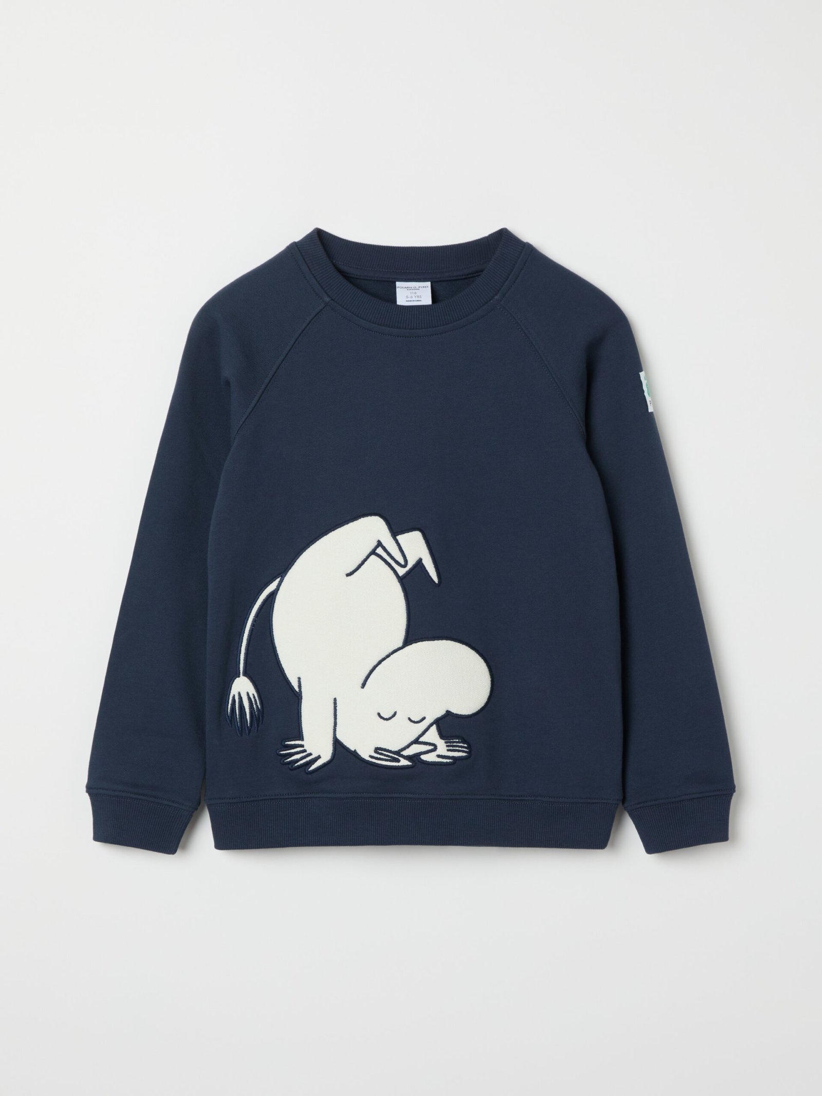 Paidan etuosassa on iso kuvio, jossa on Tove Janssonin muumitarinoiden hahmoja. Ribbiresori pääntiessä ja hihansuissa.