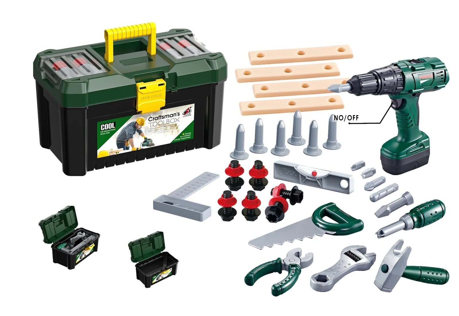 Tämä todella suuri työkalupakki on täynnä työkaluja, jotka näyttävät aivan ammattilaisen välineiltä! Pakista löydät muun muassa paristokäyttöisen porakoneen/ruuvinvääntimen sekä monipuolisen valikoiman käsityökaluja. Pakkauksen kannessa on kaksi erillistä lokerikkoa, joihin voit säilöä pienosia ja tarvikkeita. Ominaisuudet: Paristot: 2 x AA (ei sisälly) Ikäsuositus: 3+ vuotta Mitat: Pituus 33,3 cm, leveys 20,5 cm, korkeus 19,3 cm 37 osaa. Ikäsuositus 3+