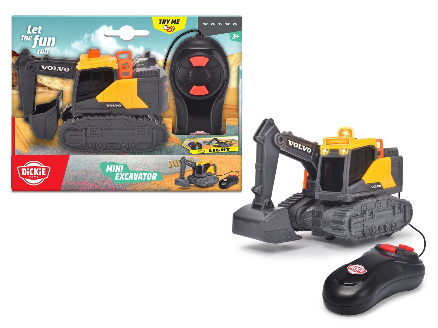 Johdollinen kaivinkone, jossa on valot Dickie Toysilta. Ota ohjaus käteen ja työnnä eteenpäin ajaaksesi kaivinkonetta eteenpäin. Voit jopa peruuttaa sitä kaarteessa. Kun ajat eteenpäin, kauha taittuu alas ja kun peruutat, se nousee ylös. Katolla oleva valo vilkkuu, kun ajat sitä eteenpäin.