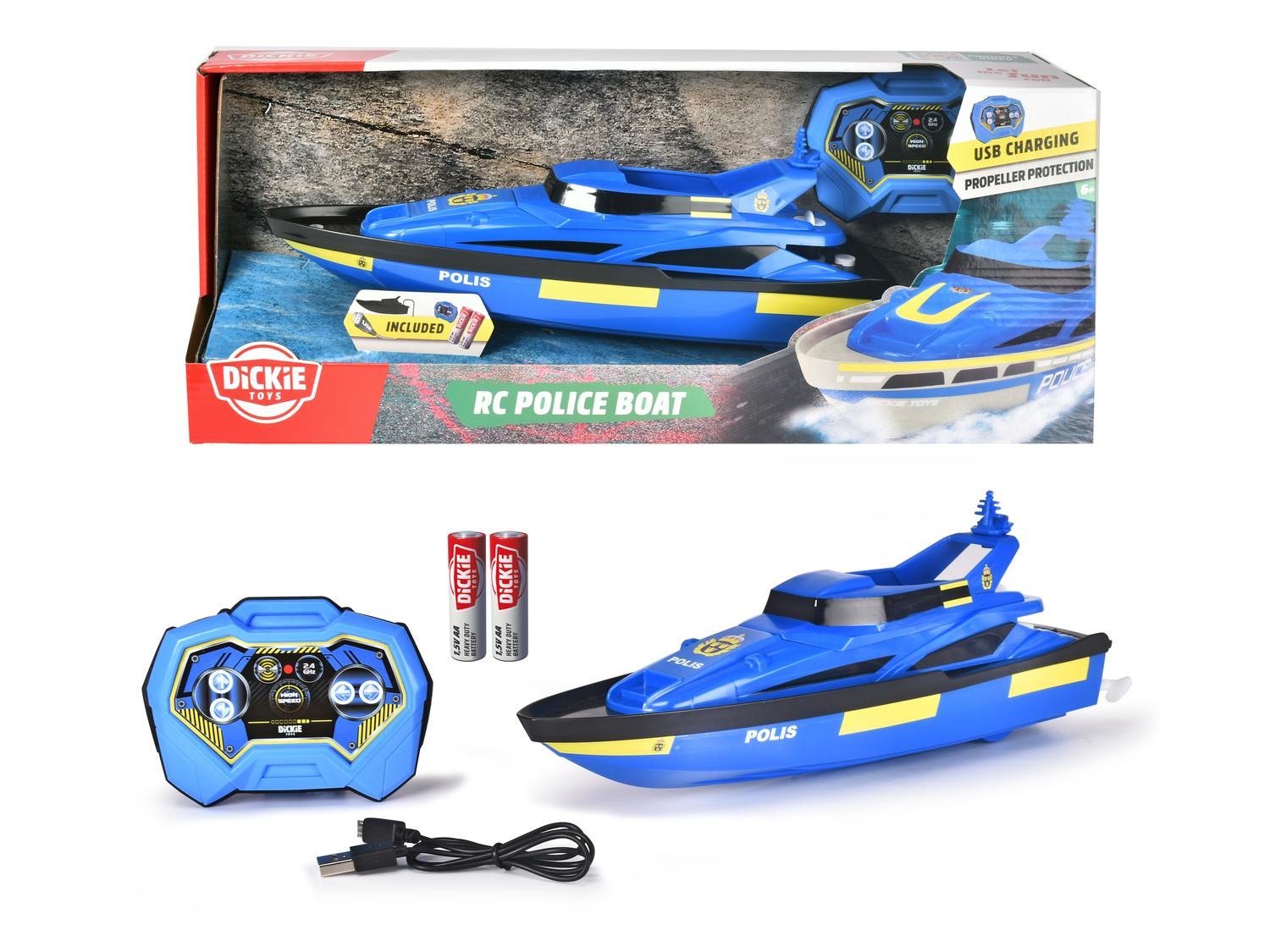 A radio-controlled police boat with two engines. Swedish police print. Have fun on the beach or by the pool with a radio-controlled boat.