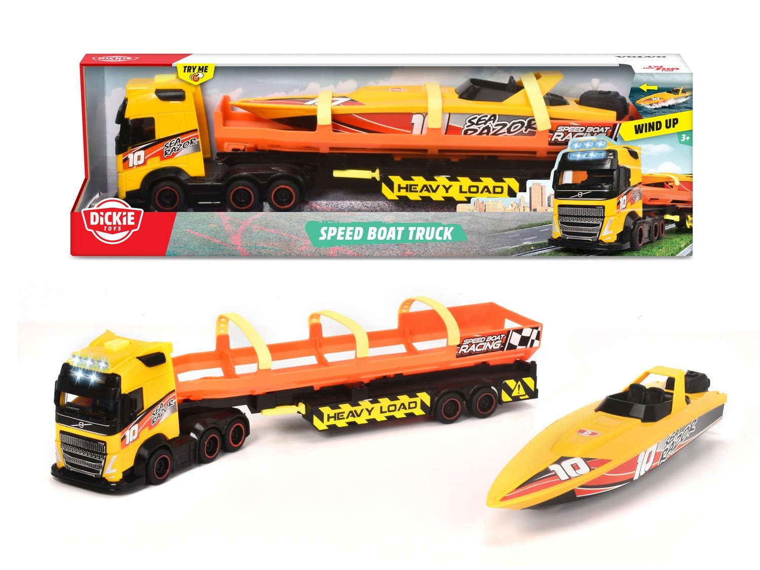 Dickie Toysin veneen kuljetus äänellä ja valolla. Kuorma-auto, jonka sängyllä on kilpavene. Veneen voi purkaa ja sillä voi leikkiä erikseen. Se kelluu, ja sen voi irrottaa ja siirtää eteenpäin, jos sillä leikitään vedessä (toimii hyvin kylpyleluna). Voit irrottaa perävaunun kuorma-autosta. Kun painat kuorma-auton katolla olevaa painiketta, kuorma-autosta alkaa kuulua moottorin ääniä ja muita ääniä, ja valot vilkkuvat.