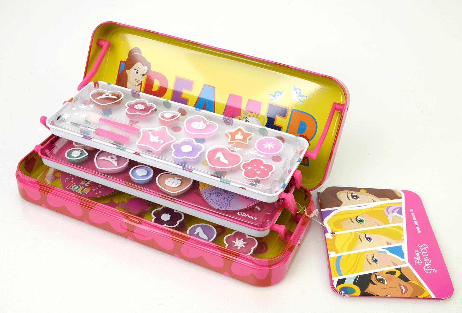 Make-up set for children in a box. The set contains lip gloss and shimmer cream in many different tints. A nice make-up box for the beginner. When you fold up the lid, the three layers fold up.