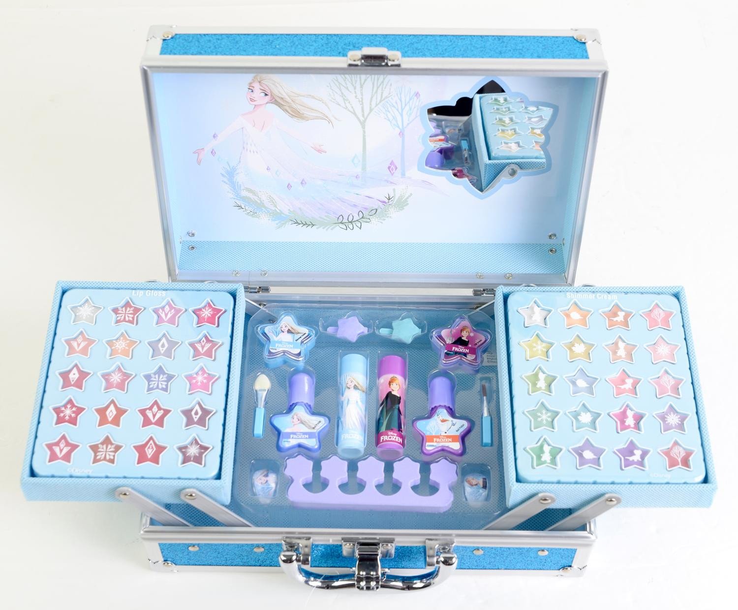 Makeup Box, make-up set for children in a Frozen-themed bag. The set contains lip gloss and shimmer cream in many different shades as well as nail polish, rings, toe separator and hair clips. A nice, glittery, make-up box with a mirror for the beginner that is easy to bring with you. Open up, unfold the layers in the bag and get started. The bag has a carrying handle and a buckle in metal.