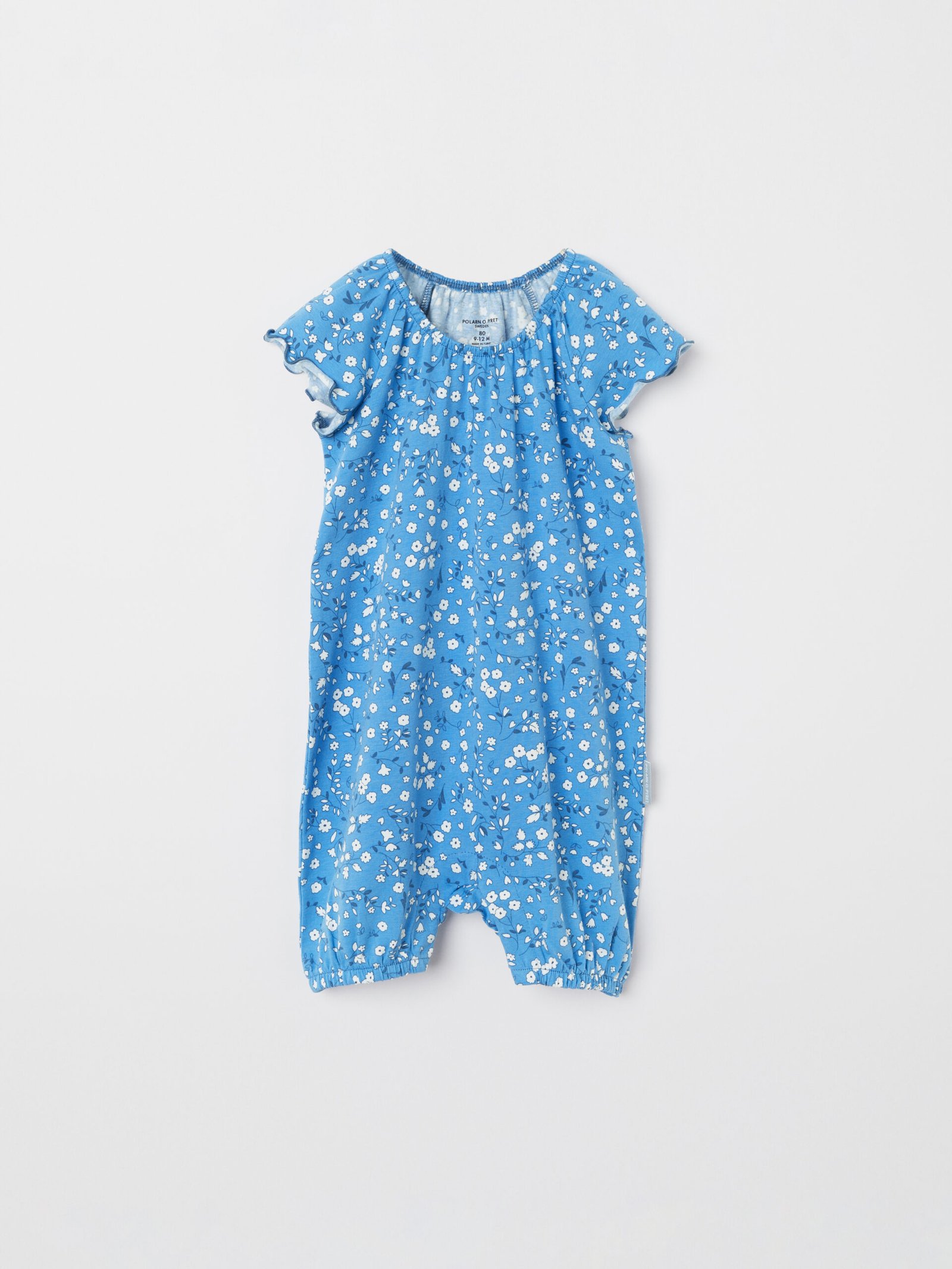 Vauvan ilmava haalari kukkakuviolla. Pehmeää luomupuuvillatrikoota. Täydellinen vaate lämpimiin kesäpäiviin! Lyhyet perhoshihat, joissa on aaltoilevat hihansuut. Joustava pääntie ja joustavat lahkeensuut. Nepparit haarassa helpottavat pukemista.