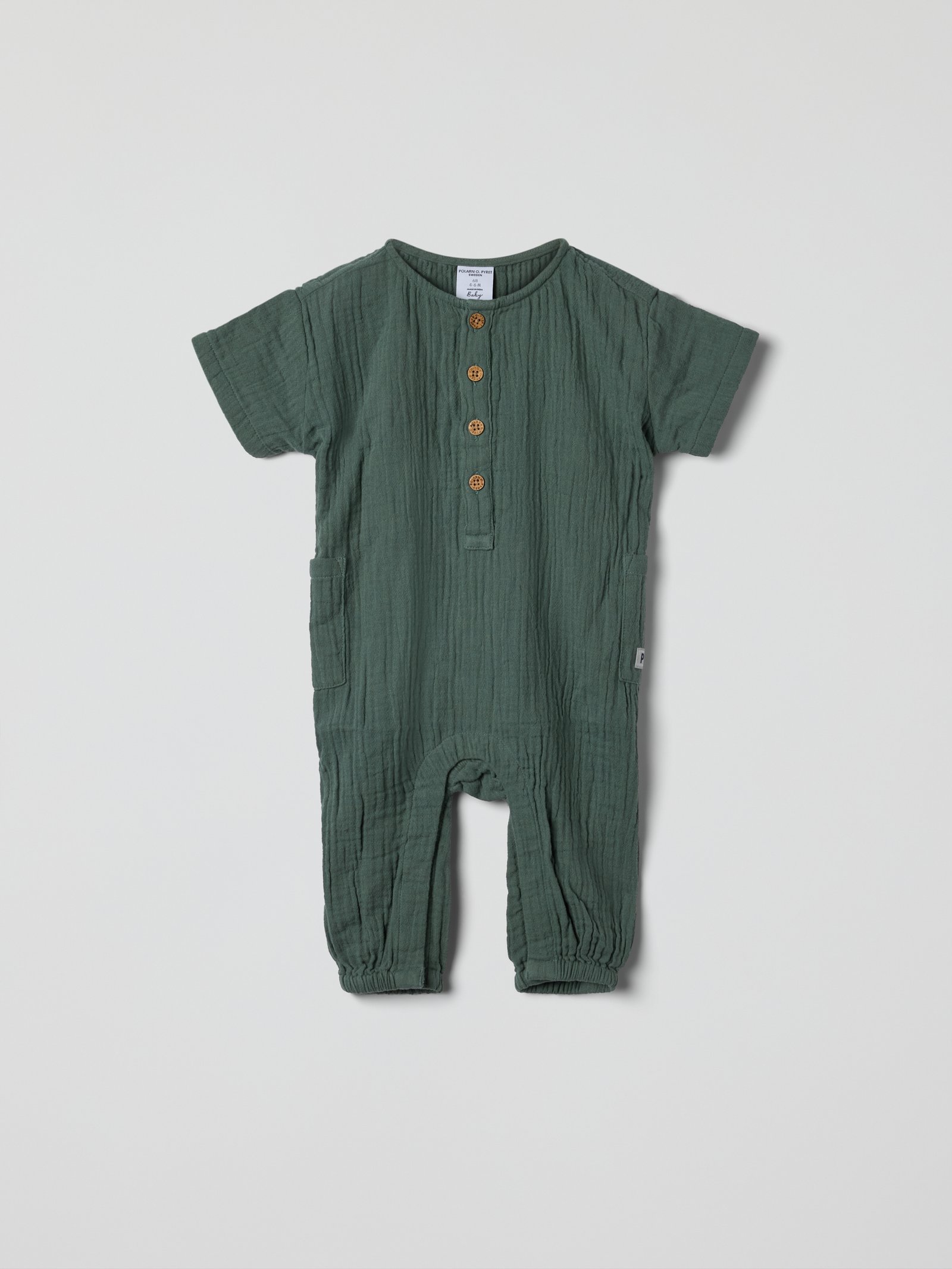 Vauvan väljä lyhythihainen haalari pehmeää 100 % luomupuuvillamusliinia – todella kaunis kesäsuosikki! Haalarissa on nappikiinnitys edessä, kaksi isoa taskua ja joustava pääntie, joka varmistaa hyvän istuvuuden.