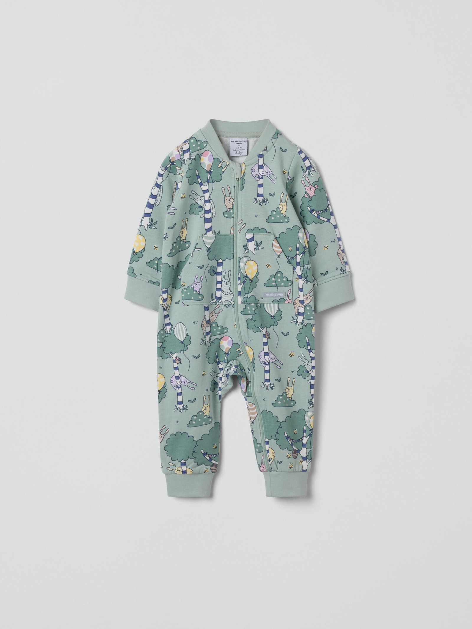 Vauvan pehmeä haalari luomupuuvillaa. Kaunista collegemateriaalia harjatulla sisäpinnalla. Haalari on kuvioitu kokonaan suloisella metsäkuviolla. Pehmeät ribbiresorit hihan- ja lahkeensuissa takaavat hyvän istuvuuden.