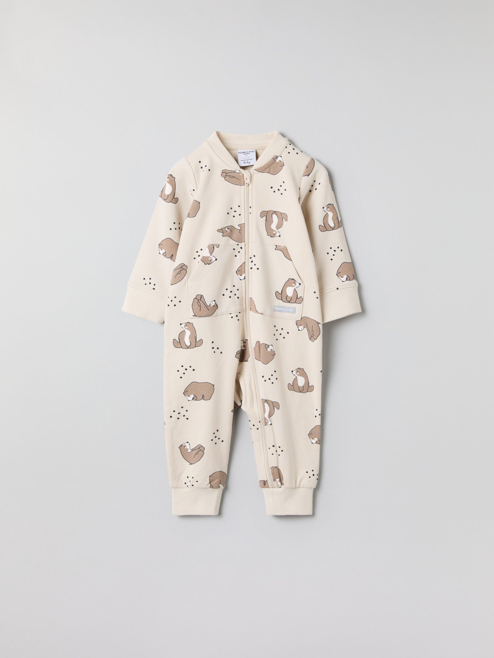 Haalari on kuvioitu kokonaan karhukuviolla. Edessä kengurutasku.