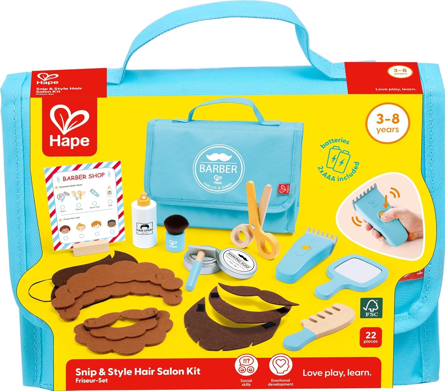 Hiusstylistin leikkisetti – kaikki valmiina tyylikkäisiin trimmauksiin! Valmistaudu hauskoihin hiusseikkailuihin tämän aidonoloisen hiusstylistin leikkisetin avulla! Setti sisältää runsaasti työkaluja ja tarvikkeita, jotka tekevät mielikuvitusleikistä monipuolista ja opettavaista. Sisältö: Sähkökäyttöinen hiustenleikkuukone realistisella äänellä Peili, kampa, harja ja sakset Partaveitsi, partavaahto ja hiusgeeli Huovasta tehty irtohius ja viikset askarteluun Kätevä säilytyspussi Ominaisuudet: Aidontuntuinen leikki: Lapset voivat eläytyä kampaajan tai asiakkaan rooliin aidontuntuisten työvälineiden avulla. Kehittää taitoja: Parantaa hienomotoriikkaa, tukee kognitiivista kehitystä ja rohkaisee vuorovaikutukseen ja kielelliseen ilmaisuun. Helpottaa pelkoja: Roolileikki auttaa lasta tottumaan hiustenleikkuuseen ja tekee oikeasta kampaamokäynnistä vähemmän jännittävän. Turvallinen ja kestävä: Valmistettu korkealaatuisista, BPA-vapaista materiaaleista. Kaikissa osissa on pyöristetyt reunat turvallisuuden takaamiseksi. Helppo säilyttää: Mukana tuleva säilytyspussi pitää tarvikkeet siististi tallessa ja opettaa lasta huolehtimaan omista tavaroistaan. Ikäsuositus: 3 vuotta +