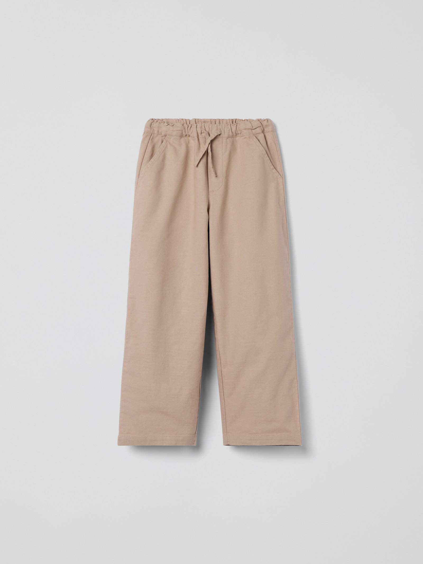 Yksiväriset housut ohutta, pellavalta tuntuvaa luomupuuvillaa – mukavat sekä arkeen että juhlaan! Housuissa on suorat lahkeet, kaksi etutaskua sekä joustava vyötärö, jota voi säätää kiristysnauhalla.