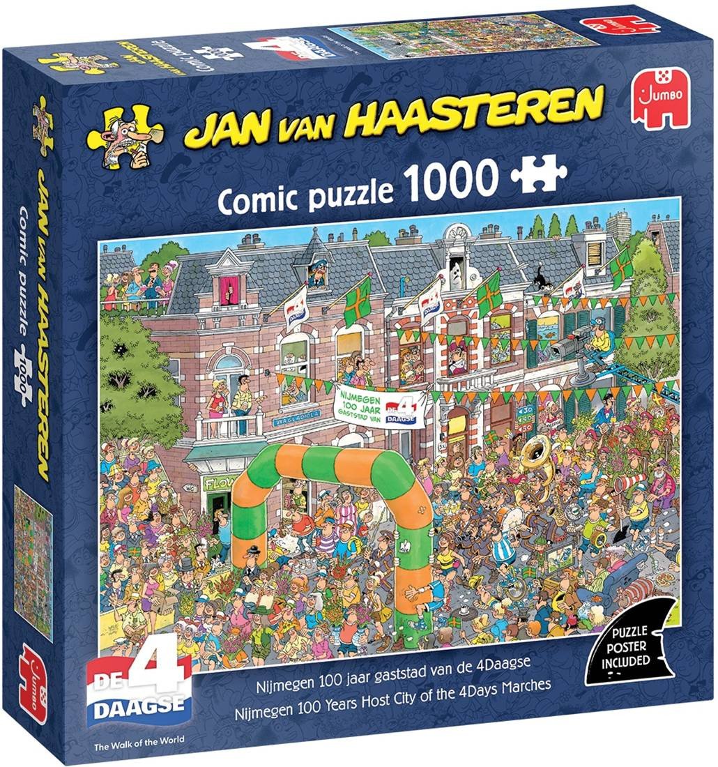 Jan Van Haasteren, koominen 1000-palainen palapeli, jossa on paljon hauskoja yksityiskohtia. JvH-palapeleistä löydät usein useita toistuvia yksityiskohtia (ehkä löydät esimerkiksi hain evän, joulupukin, haamun tai paavin?). Palapeliaiheinen juliste on mukana.