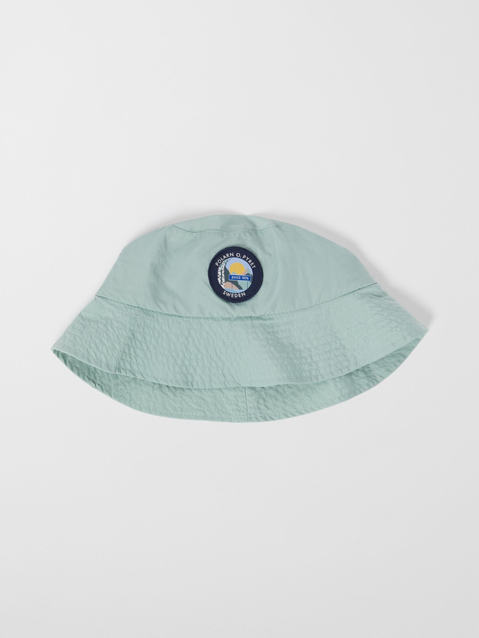 Kierrätetystä nailonista valmistetussa hatussa on brodeerattu ilmanvaihtoaukko ja edessä koristeellinen applikointi.
