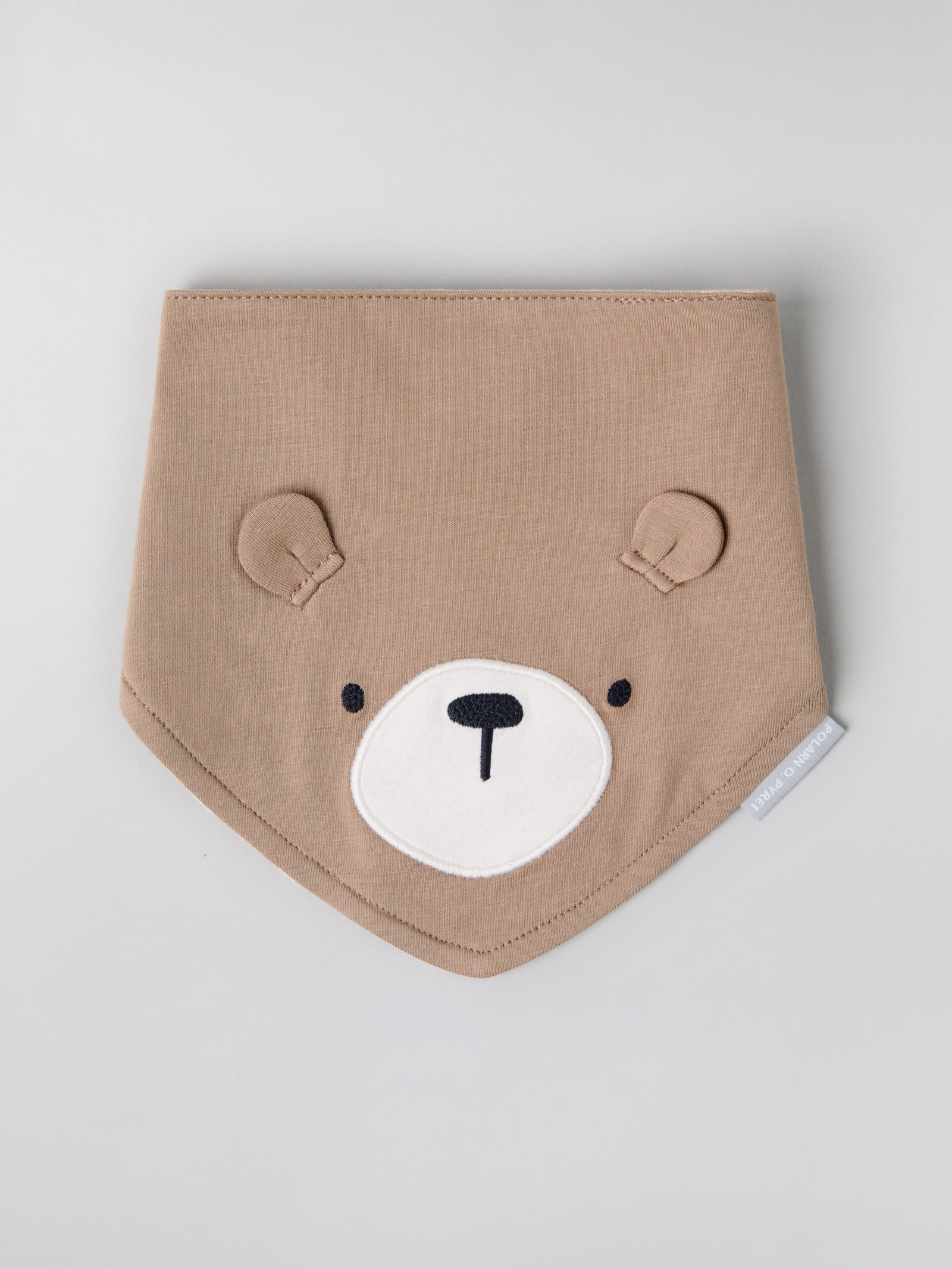 Käännettävän kaulalapun toisella puolella on suloisen karhun kasvot ja toisella puolella klassinen raitakuosimme.