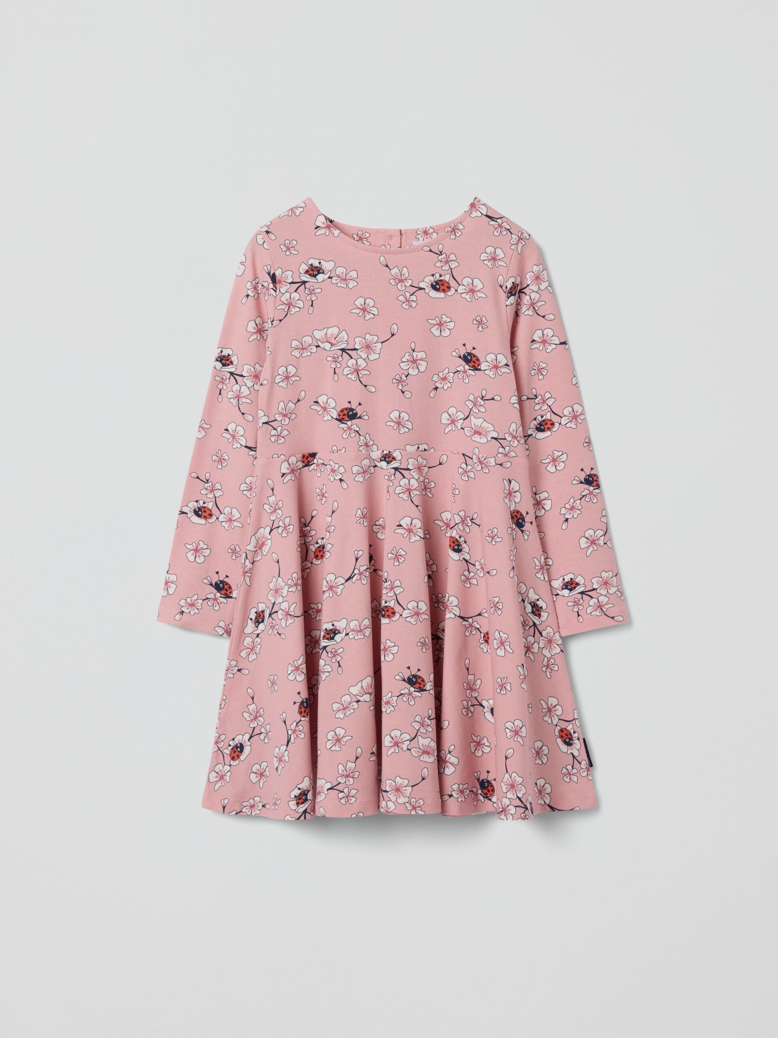 Tämä mekko on lapsen vaatekaapin suosikki! Valmistettu pehmeästä luomupuuvillatrikoosta. Erityisen leveä hameosa, joka näyttää hienolta pyöriessä. Mekko on kuvioitu kokonaan kukkakuviolla. Nappilista takana.
