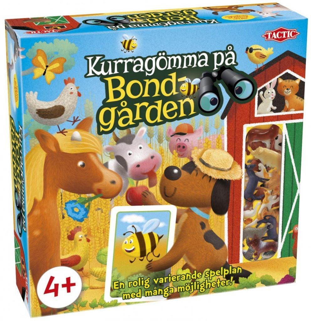 I Tactic Kurragömma på Bondgården gäller det att hitta de gömda djuren. En dubbelsidig spelplan med 12 bitar som kommer se olika ut varje gång man spelar. Hitta djuren på spelplanen och samla djurfigurer. Spelet tränar barns observationsförmåga på ett roligt sätt när de får leta efter både små och stora djur på spelplanen. Med lite tur kanske du får ta en tur i traktorn? De medföljande figurerna i form av bondgårdsdjur gör spelet extra roligt.