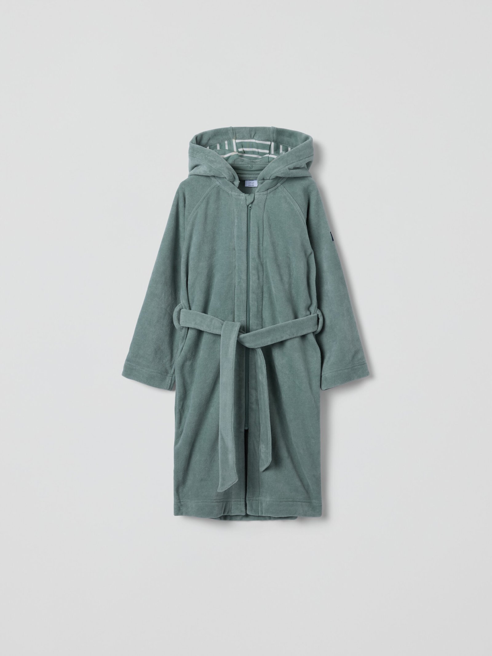 Yksivärinen kylpytakki pehmeää ja mukavaa luomupuuvillaa ja kierrätettyä polyesteriä. Irrotettavassa hupussa on puuvillatrikoovuori, jossa on klassinen raitakuosimme. Aamutakki ulottuu pohkeeseen asti. Kiinnitetään vetoketjulla ja solmimisnauhalla.