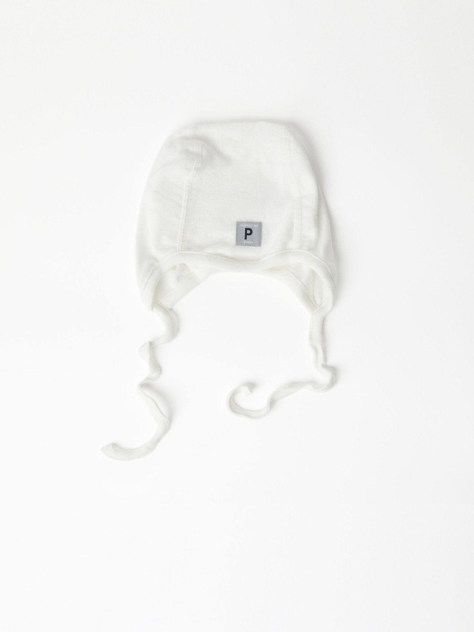 Vastasyntyneen yksivärinen kypärämyssy 100 % luomupuuvillaa. Leuan alta solmittavien nauhojen avulla se pysyy hyvin paikoillaan.