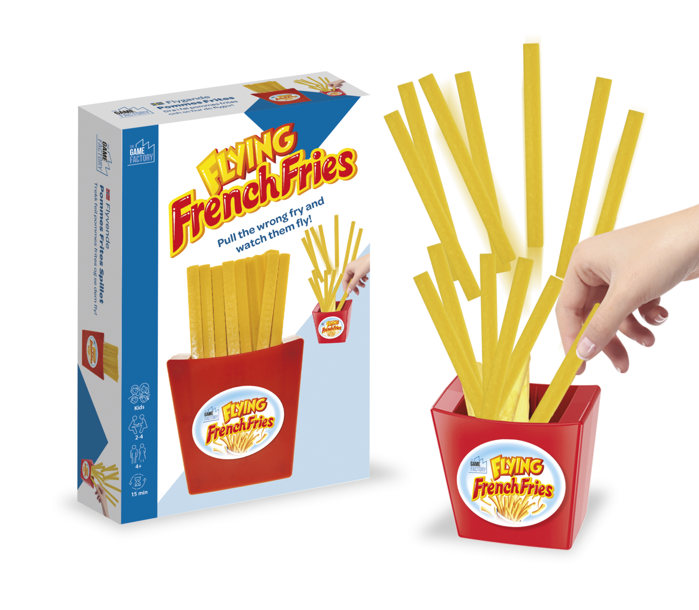 Varo lentäviä ranskalaisia!Pelaajat vuorottelevat vetämällä ranskalaisia perunoita pakkauksesta. Kuka vetää sen tikun, joka saa kaikki perunat sinkoamaan ilmaan? Paina ensin laatikon pohja alas ja aseta kaksi kiinteää ranskalaista paikalleen. Lisää sitten loput perunat ja sekoita. Sen jälkeen pelaajat nostavat ranskalaisia yksi kerrallaan. Jos vedät väärän – kaikki ponnahtavat ilmaan! Sisältö: 1 ranskalaislaatikko ja 20 ranskalaista.Mitat: laatikko n. 8,5 × 4,5 × 8 cm, ranskalaiset n. 10 cm pitkiä.Pelaajamäärä: 2–4Peliaika: n. 15 minIkäsuositus: 4+