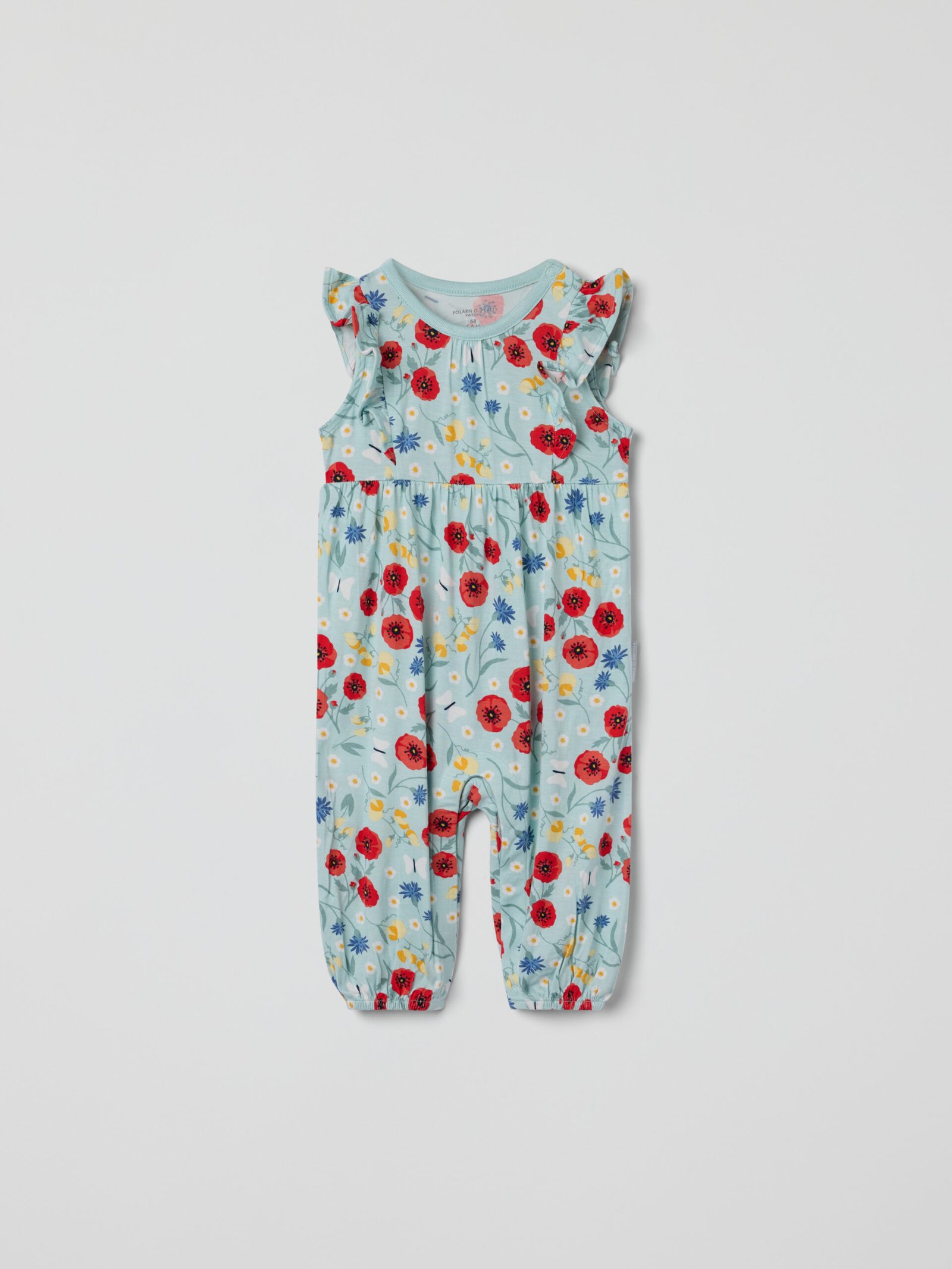 Vauvan kukkakuvioinen lyhythihainen haalari ohutta ja vilpoisaa Ecovero™-viskoositrikoota – täydellinen kesähelteillä! Etuosassa on pehmeät röyhelöt, jotka jatkuvat olkapäiden yli.