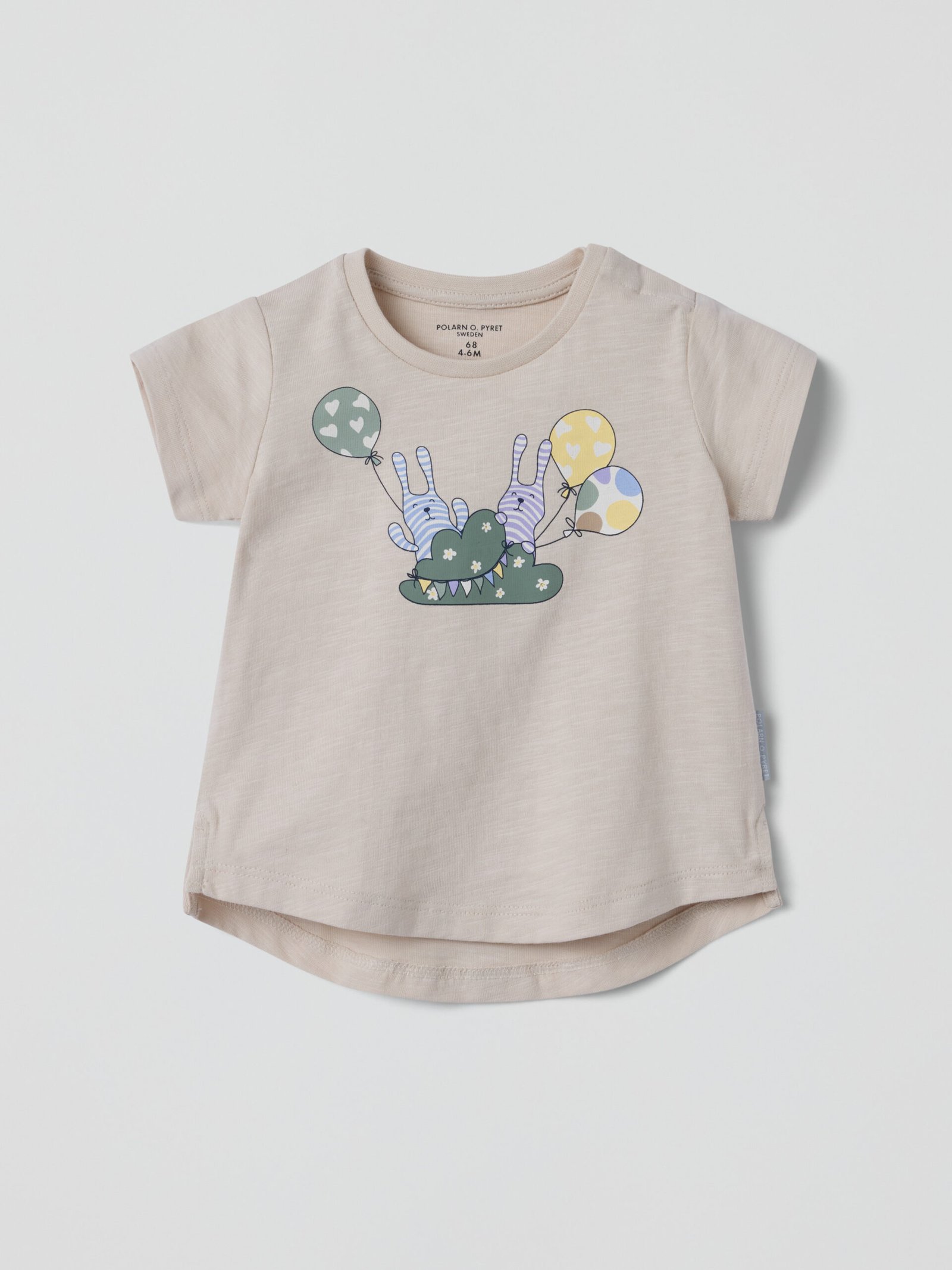 Lyhythihainen paita pehmeää ja mukavaa slub-materiaalia. 100 % luomupuuvillaa. Pyöreä helma. Puserossa on väljä istuvuus ja suloinen painatus kaneista etupuolella.