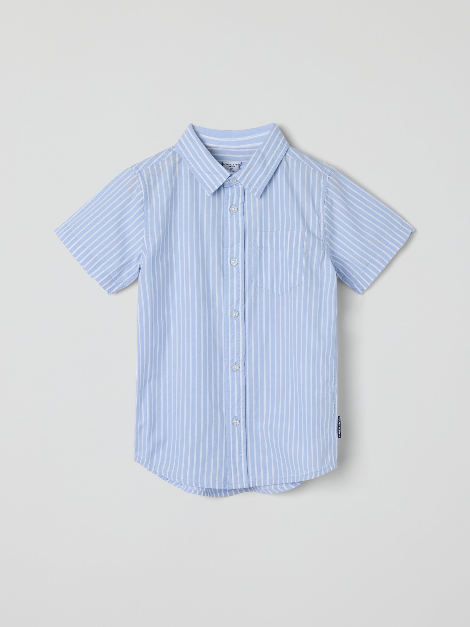 Lyhythihainen raidallinen paita pehmeää luomupuuvillapopliinia – täydellinen sekä arkeen että kesäjuhliin! Paidassa on rintatasku ja edessä nappikiinnitys.