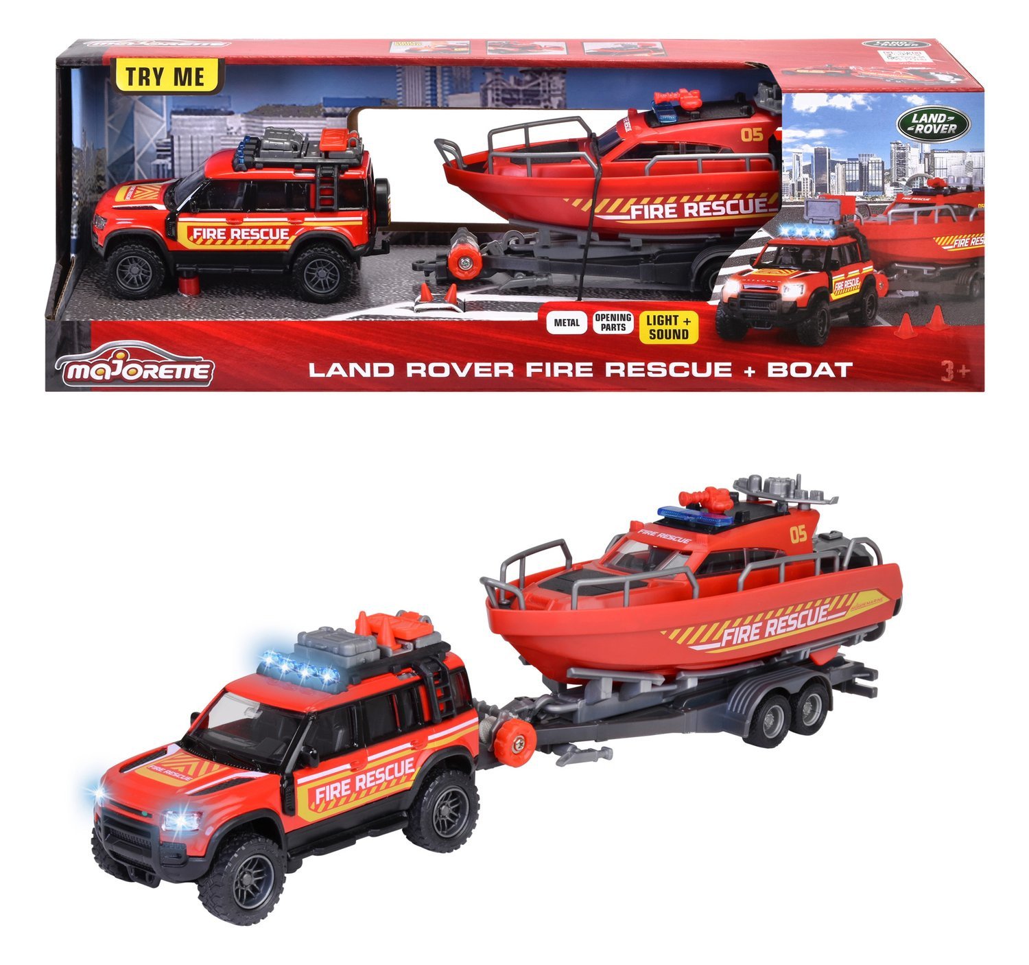 Paloauto venekuljetuksella. Paloautossa on äänet ja valot. Etuosaa painettaessa se alkaa torvia ja valot vilkkuvat. Perävaunun voi kytkeä päälle ja pois. Pelastusvene voidaan purkaa perävaunusta. Kun aiot lastata venettä, kiinnitä perävaunun vinssi veneen keulaan ja pyöritä sitä ylös. Auton takaluukku voidaan avata.