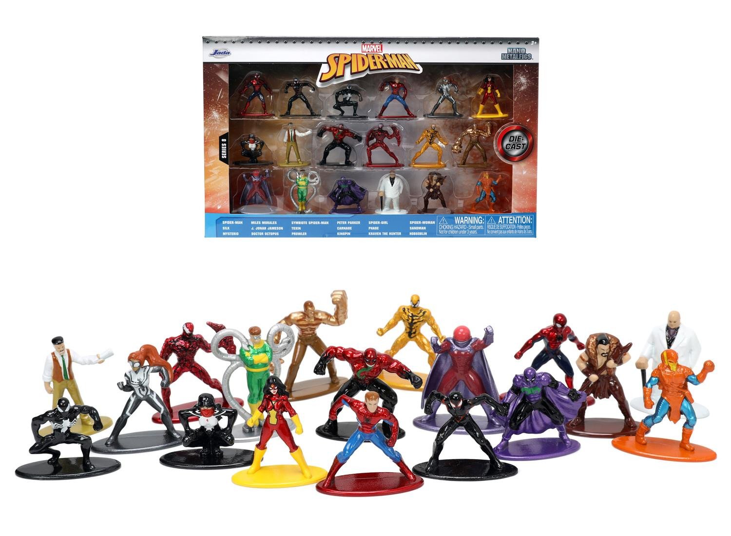 Sisältää: 18 metallihahmoa (Spiderman, Miles Morales, Peter Parker, Spiderwoman, Symbiote Spiderman, Spidergirl, Phage, Carnage, Sandman, Toxin, J. Jonah Jameson, Silk, Mysterio, Doctor Octopus, Kingpin, Prowler, Kraven the Hunter ja Hoblinter ) .