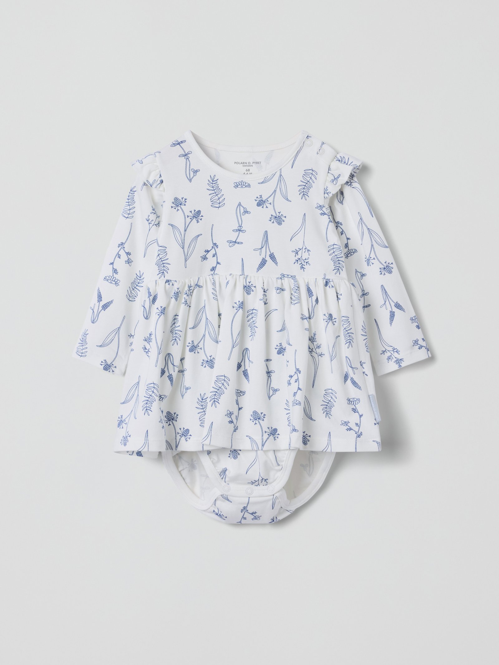 Vauvan mekon ja bodyn kätevä yhdistelmä pehmeää luomupuuvillaa. Mekko on kuvioitu kokonaan kukkakuviolla. Olkapäillä hienot röyhelöt.