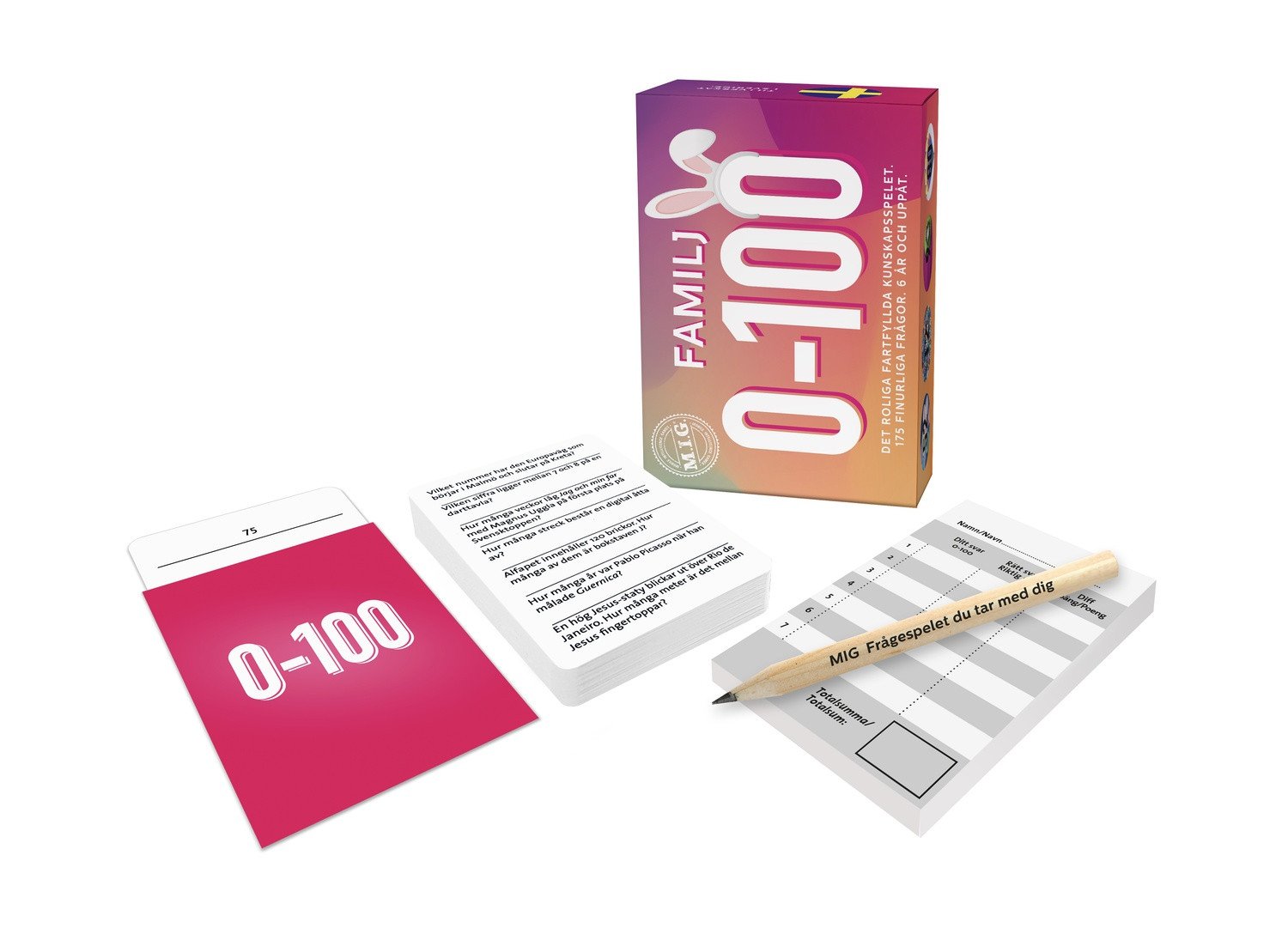 MIG 0-100 familj är ett roligt och snabbspelat frågespel där du alltid har ett svar. Svaret är alltid ett tal mellan 0 och 100. Om du inte kan får du gissa och närmast rätt svar vinner. Yngre barn får hjälp av ett enkelt handikappsystem. Mini 0-100 i ett litet format som är enkelt att ta med sig vart man än ska.