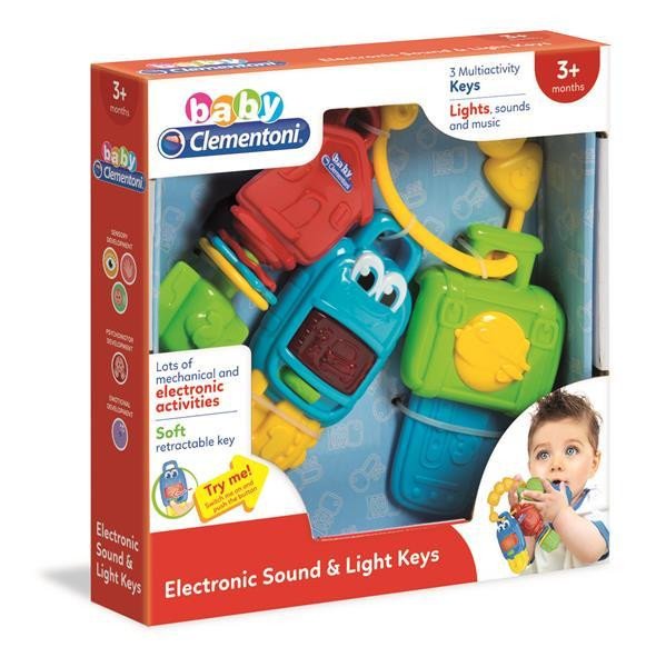 Clementoni Activity keys with many fun mechanical and electronic activities. The colorful keys are easy to grip for small hands. One of the keys has sound and light and when you press it, different car sounds and music are heard. The other keys have things to screw on, spin on, rattle with and things to wiggle on. Cheerful colors and different structures make the car keys interesting for the youngest children.