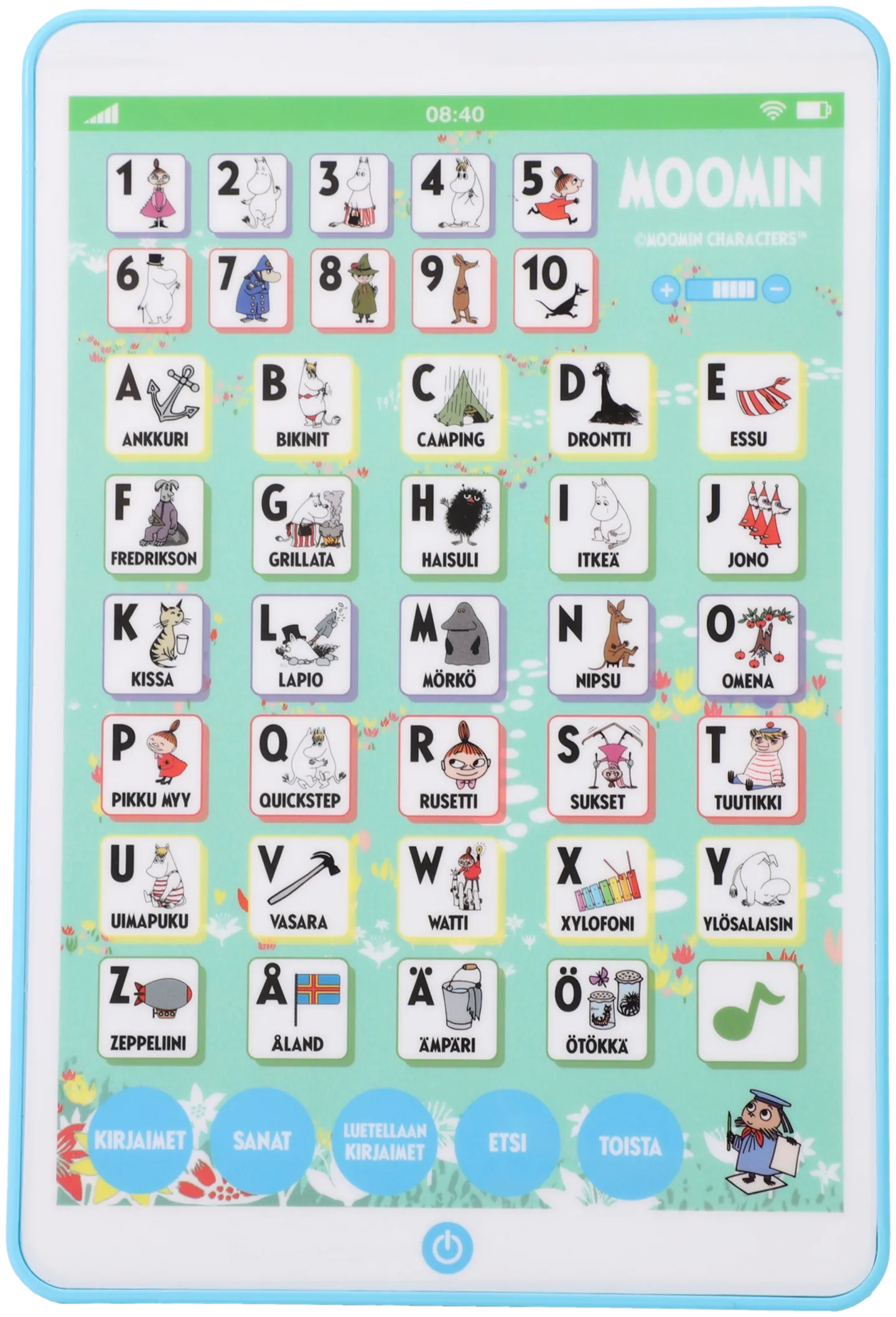 Muumi-aiheinen tabletti vie lapsen hauskalle ja opettavaiselle matkalle kirjainten, numeroiden ja Muumien maailmaan! Laitteessa on yli 30 erilaista toimintoa, jotka tekevät oppimisesta innostavaa. Suomenkielinen tabletti sisältää paristot, joten se on heti valmis käyttöön. Ominaisuudet: Opi kirjaimia ja numeroita yhdessä Muumien kanssa Yli 30 erilaista toimintoa Toimii 3 x AAA-paristoilla (sisältyvät pakkaukseen) Suomenkielinen käyttö Ikäsuositus: yli 3-vuotiaille
