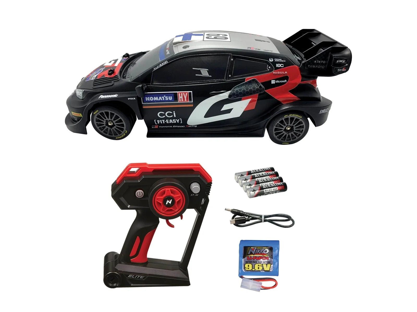 1:14 Elite Race Cars – huippuluokan suorituskykyä ja tarkkuutta rata-ajoon! Hallinnoi kisaa harrastetason osilla ja tarkalla ohjauksella. Toyota Gazoo Racing Rally 1 -malliin perustuva kilpa-auto tarjoaa kaikki tarvittavat ominaisuudet, joilla nouset radan kuninkaaksi. Nopeasti ladattava 9,6V USB-C LiFePo4-akku, tehokas 360-moottori, kevyt vakuumimuovattu kori, riippumaton jousitus metallisilla ohjausvarrella sekä takatasauspyörästö takaavat vauhdin ja hallittavuuden. Nikko Elite -ohjain mahdollistaa jopa 40 auton moninpeliajot, digitaalisen portaattoman kaasun ja trimmauksen, joilla säädät hallinnan juuri omiin tarpeisiisi. Mukana USB-laturi. Tekniset tiedot: Koko: 1:14, pituus 34 cm Taajuus: 2,4 GHz Kaukosäädin: 4 x AAA-paristoa (sisältyy) Ajoneuvo: 9,6V LiFePo4-akku (sisältyy) Latausaika: 60–90 min Ajoaika yhdellä latauksella: 15–20 min Huippunopeus: jopa 24 km/h Kantama: jopa 50 m Suositusikä: 8+