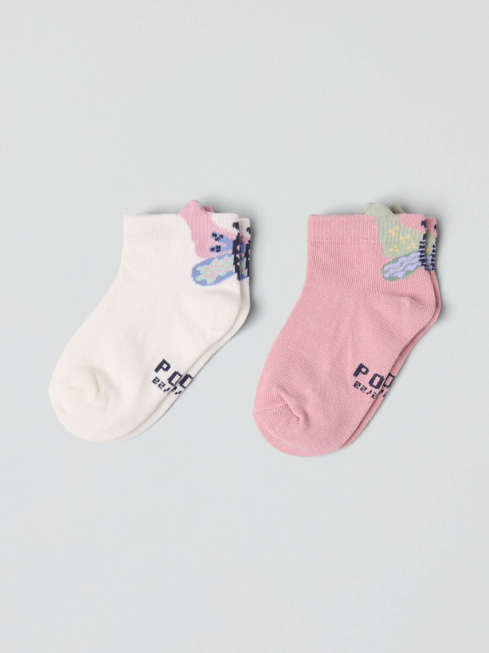 Kahden parin pakkaus nilkkasukkia, pehmeää luomupuuvillaa. Kauniit pienet perhoset kantapäässä – todella mukavat kesäsuosikit!