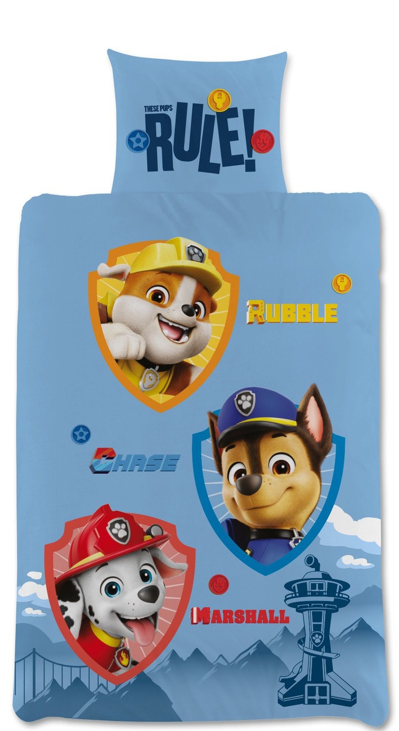 Pussilakanasetti Ryhmä Hau -aiheella (Marshall, Chase ja Rubble). Nuku hyvin ja unelmoi suosikkihahmoistasi! Täydellinen ja hyödyllinen lahja tai joululahja kaikille Ryhmä Hau -faneille!