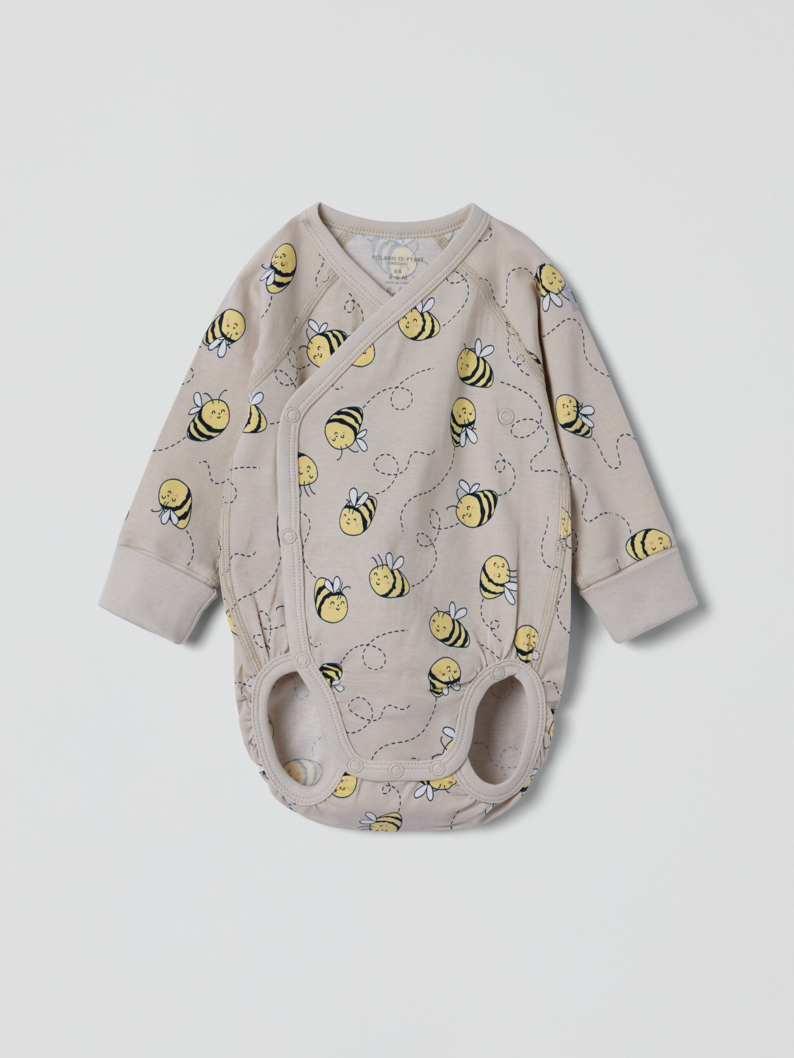 Pidennettävä kietaisubody 100 % luomupuuvillaa. Kuvioitu kokonaan mehiläiskuviolla. Lisärivi neppareita haarassa ja taitettavat resorit hihansuissa, joten body kasvaa lapsen mukana!