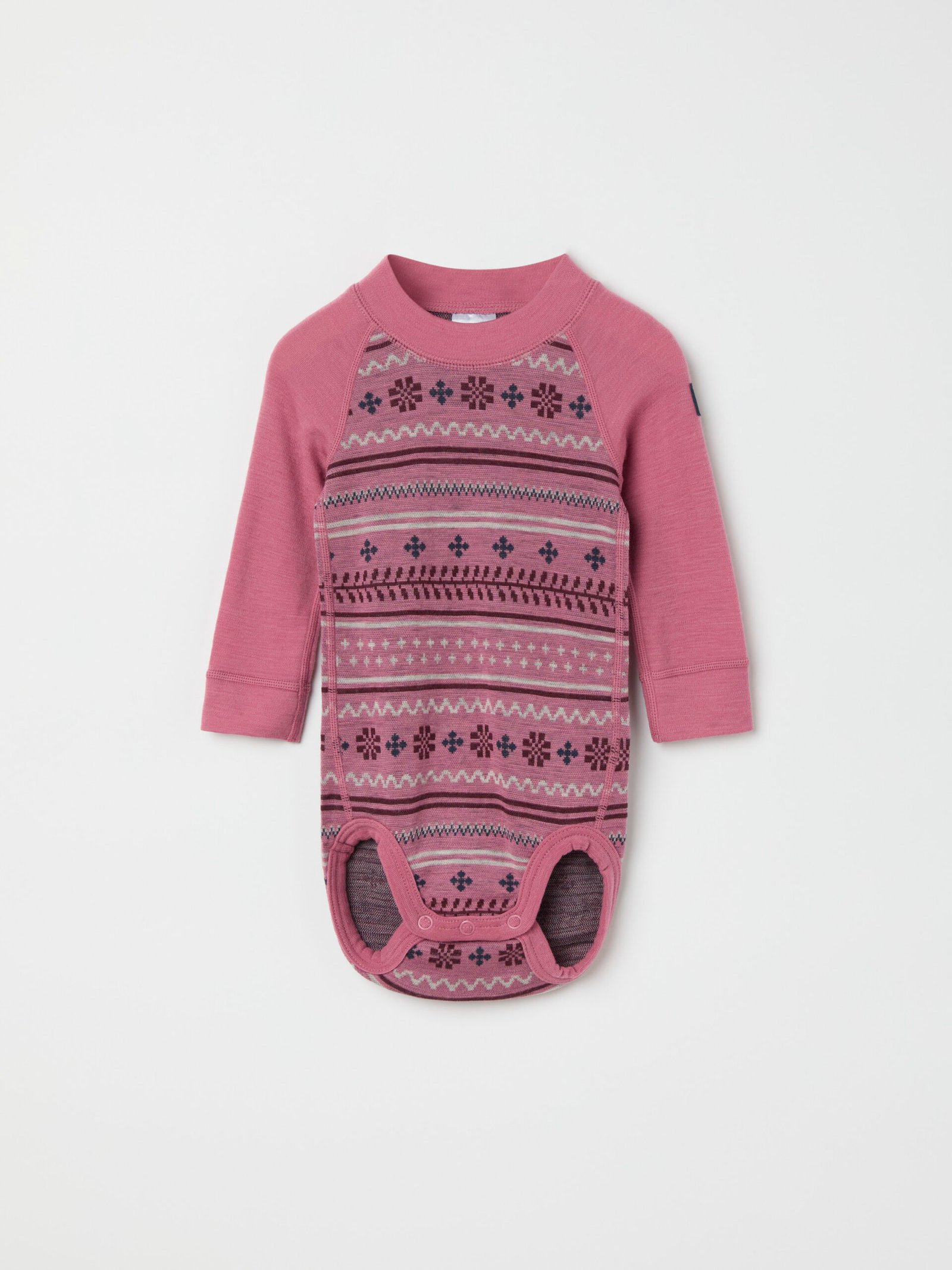 Lämmittävästä merinovillasta valmistettu vauvan pitkähihainen jacquard-kuvioinen body. Täydellinen aluskerrasto toppahaalarin alle!