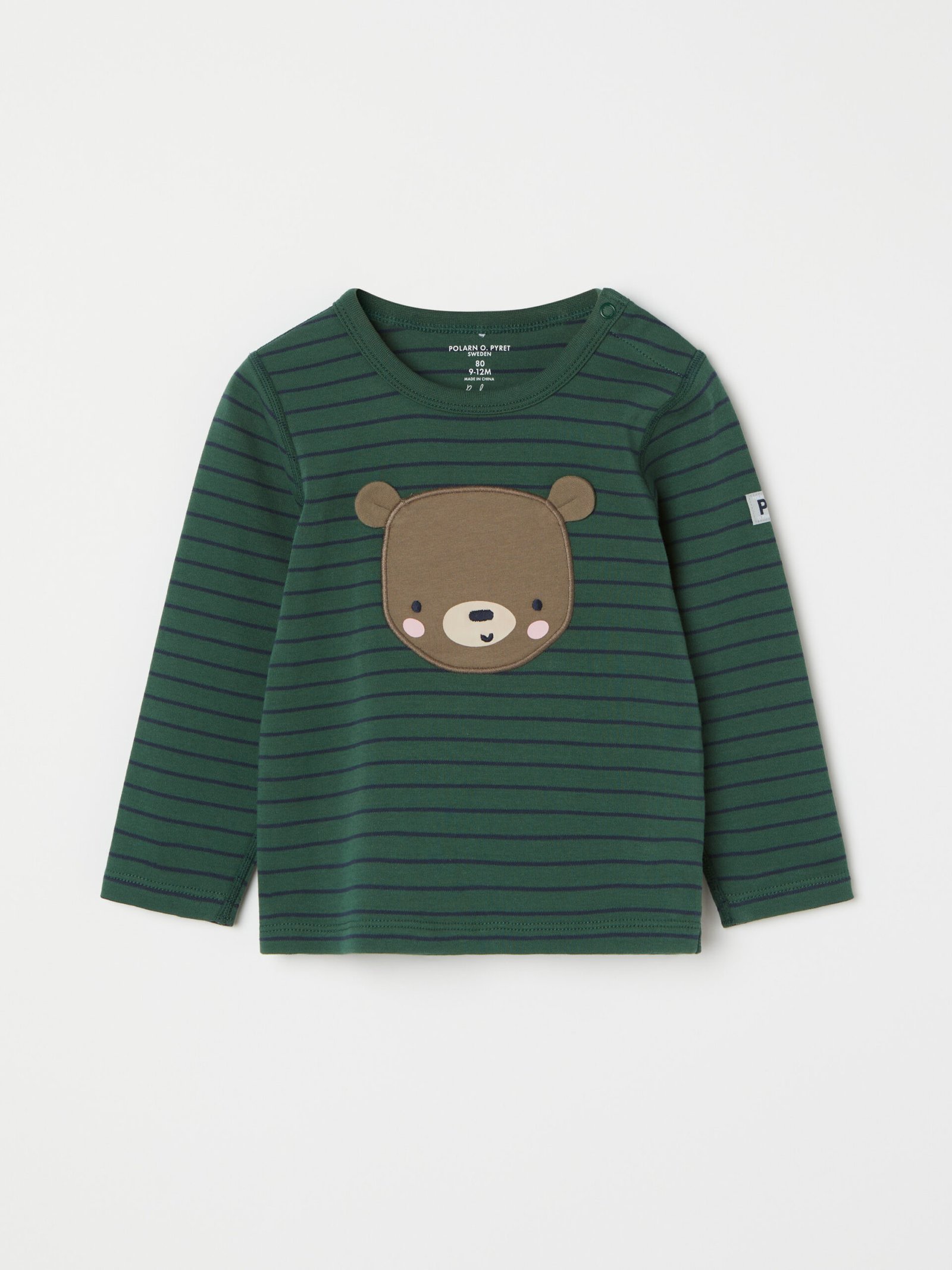 Vauvan raidallinen paita 100 % luomupuuvillaa. Paidan etuosassa on pehmeä karhuapplikointi.