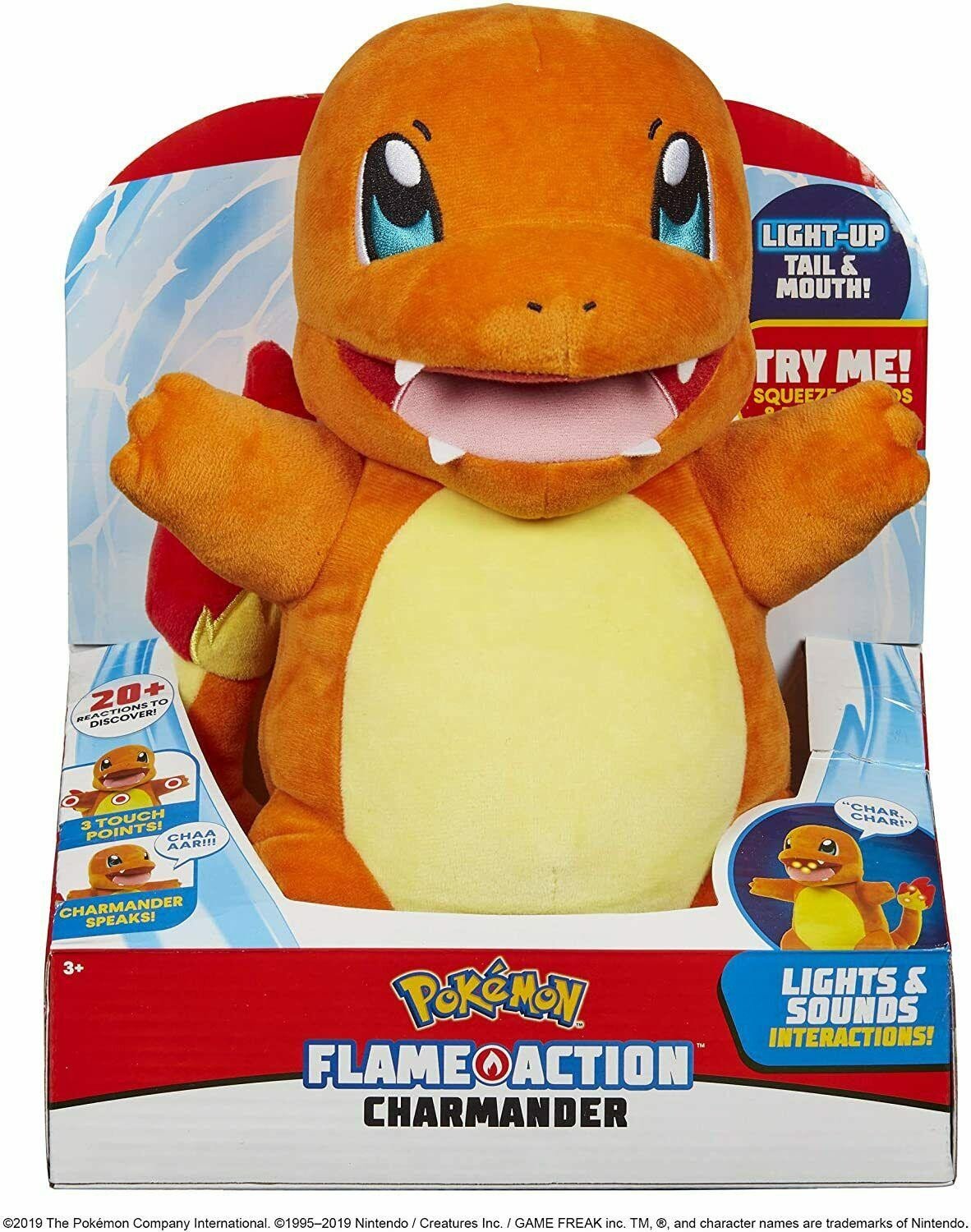 Pokemon Flame Action Charmander on interaktiivinen pehmolelu, jossa on ääntä ja valoa. Kosketa yhtä kättä tai rintaa ja löydä yli kaksikymmentä erilaista reaktiota. Charmander puhuu leikkisällä äänellä tai taisteluäänellä, ja kuulet tulen ääniä. Suu ja hännän kärki valaisevat. Paina ja pidä painettuna käynnistääksesi erityisreaktiot.