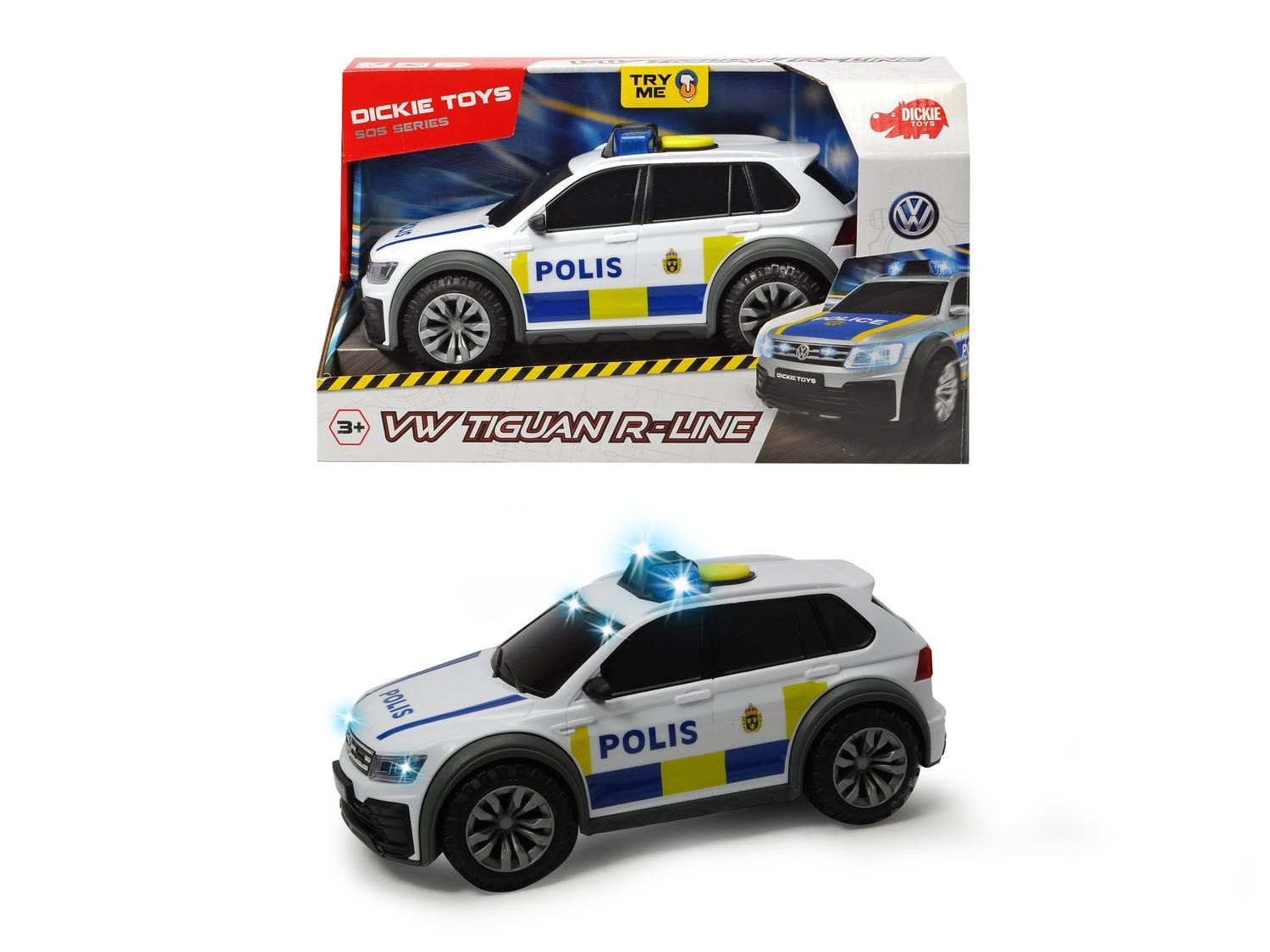 Kova poliisiauto äänellä ja valolla Dickie Toysilta. Autossa on ruotsinkielinen teksti! Kun painat auton katolla olevaa painiketta, se alkaa honrata, moottorin ääniä ja muita poliisin ääniä valojen vilkkuessa.
