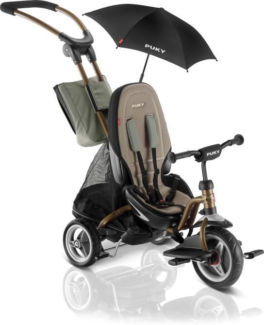 Puky Carry Premium Kolmipyöräinen Braun on Pukyn ylellinen kolmipyöräinen pyörä, jossa on paljon hienostuneisuutta ja maksimaalista liikkuvuutta arjessa. Lisätaskun ja lukittavan verkon ansiosta voit kuljettaa paljon matkatavaroita mukanasi.Suuri ja pehmustettu istuin viisipistevyöllä ja jalkatuella antaa optimaalisen tuen lapselle, jopa nukkuessa, ja tukikaari antaa optimaalisen hallinnan. Ohjausyksikkö, jota voi lukita yhdellä kädellä, takaa tarkan suoran liikkeen, kun työnnät Puky Carry Premium Kolmipyöräisetä Braunia. Vain yhdellä kädellä voit käyttää vapautusmekanismia, joka on riippuvainen siitä, onko ajoneuvo työnnettävänä vai leikkikäytössä.Tämä monikäyttöinen 2-in-1 vaunupyöräinen kolmipyöräinen pyörä vaikuttaa monipuolisilla ominaisuuksillaan ja muuttuu vaunupyörästä kolmipyöräiseksi pyöräksi. Taitettavan selkänojan, irrotettavan korkeussäädettävän työntöaisan, irrotettavan XL-varastolaatikon, sade/auringonsuojan ja suuren kangaspäällysteen ansiosta Puky Carry Premium Kolmipyöräisetä Braun on erittäin monipuolinen ja mukava. Kattava lisävarustepaketti, joka koostuu kellosta, käsikorista, käsilaukusta tai lipusta, muokkaa ylellisajoneuvoa edelleen yksilöllisiin tarpeisiin.Puky Carry Premium Kolmipyöräinen Braun sopii lapsille, jotka ovat vähintään 1,5-vuotiaita, ja sillä on enimmäiskuormitus 25 kg. Askelkorkeus voidaan säätää välillä 32–38 cm, ja pyörän korkeus on 80–100 cm. Se on varustettu turvakahvalla, iskunkestävällä maalauksella, sisäänrakennetulla ohjausrajoittimella, turvalukituksella työntöaisassa, vapautusmekanismilla, käsijarrulla/pysäköintijarrulla ja iskunvaimentimilla.Säädettävällä Ergo-urheiluistuimella pehmeällä istuinpäällisellä yhdessä säädettävän 5-pistevaljaiden kanssa on lyömätön turvallisuuden ja käyttäjäystävällisyyden suhteen. Monikäyttöinen työntöaisa kaupunkilaukulla ja AIR-Less-mukavuushalkaisijalla tekee matkoista miellyttäviä ja helppoja. Puky Carry Premium Kolmipyöräinen Braun tarjoaa premium-kolmipyöräisen pyörän, jossa on mukavuusominaisuuksia ja erottuva kangasdesign, joka korostaa pyörän visuaalisia vaatimuksia parhaassa luokassaan.