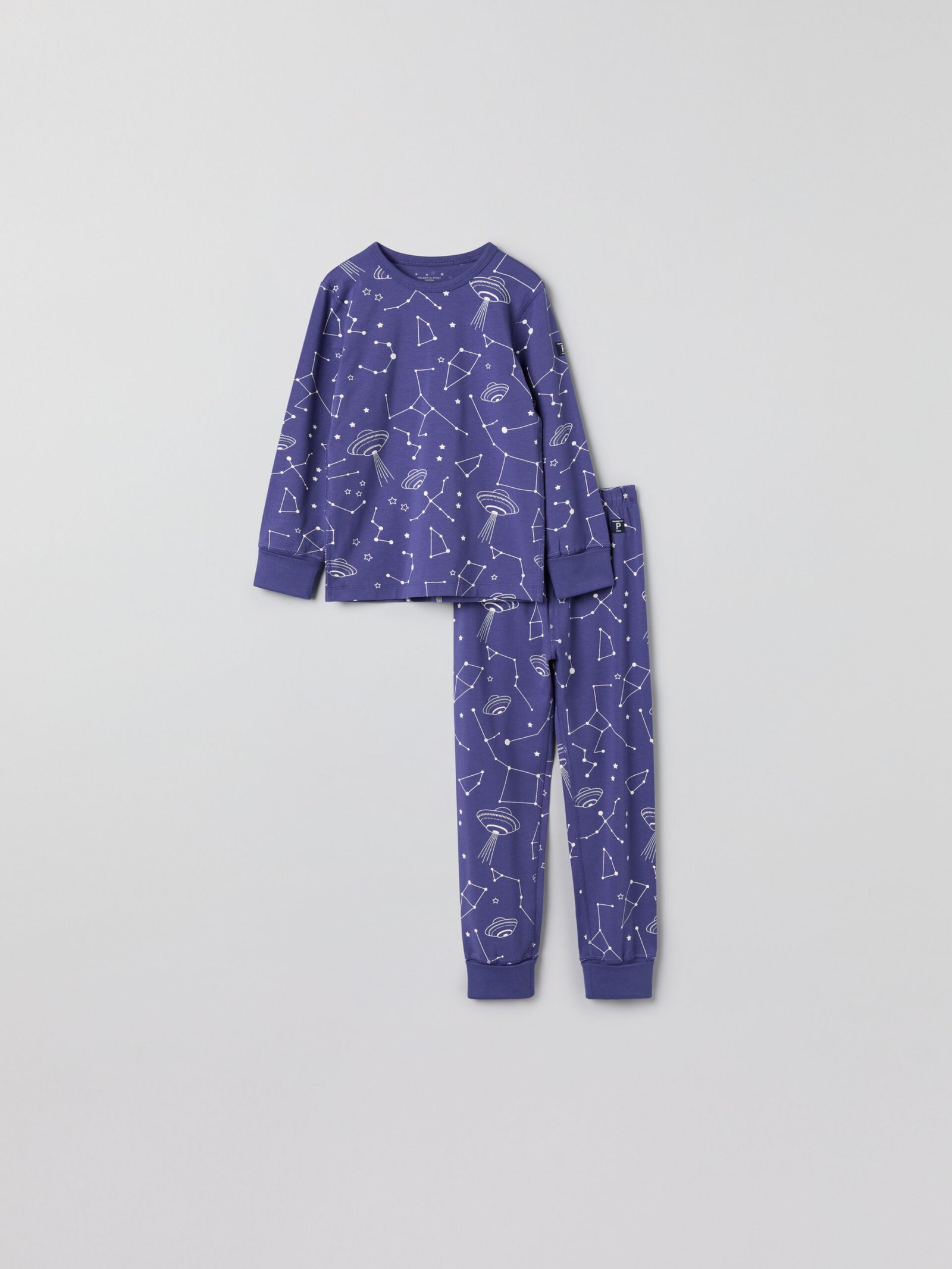 Kaksiosainen pyjama pehmeää luomupuuvillaa. Kuvioitu kokonaan avaruuskuviolla. Paidan hihansuissa on erityspitkät resorit, jotka voi taittaa ylös ja alas. Housuissa on joustava vyötärö ja erittäin pitkät resorit lahkeensuissa.