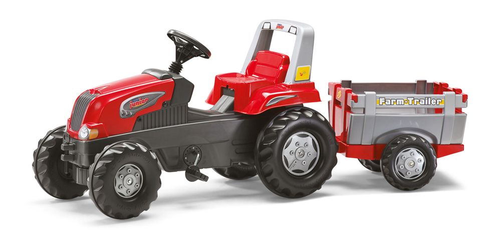 Rolly Junior Traktori m. Farm Trailer on hieno leikkikone lapsille iältään 3-8 vuotta. Rolly Toysin traktorissa on kätevä perävaunu lisää hauskuutta leikkiin. Traktori on suunniteltu avoimella jäähdyttimellä, joka voidaan avata, jotta pieni ajaja voi päästä leluihin ja muihin vastaaviin, ja ketjun suojaus varmistaa turvallisuuden. Hiljaiset renkaat estävät leikin häiritsemistä kovalla jyrinällä polkemisen aikana. Lisäksi penkki on säädettävissä sopivaksi lapsen koon mukaan ja varmistaa mukavan ajon. Rolly Junior Traktori m. Farm Trailer on suuri ja kestävä, mitoiltaan 162 x 53 x 62 cm. Traktori ja perävaunu voivat kantaa jopa 50 kg, joten on mahdollista kuljettaa kuorma mukana maatilalla. Tällä traktorilla lapsi voi helposti kuljettaa hiekkaa, likaisia vaatteita tai leluja ympäriinsä, ikään kuin oikealla tilatraktorilla. Kaiken kaikkiaan tämä on hauska ja monipuolinen leikkikone, joka tarjoaa tuntikausia hauskaa ja kehittää lapsen motorisia taitoja ja koordinaatiota. Rolly Junior Traktori m. Farm Trailer on traktori, josta lapsi tulee pitämään ja joka tuo uuden ulottuvuuden leikkiin. Se sopii myös täydellisesti lapsille, jotka pitävät kaikista ajoneuvoista. Se on hyvä sijoitus pienille, jotka huvittelevat pitkään eivätkä kyllästy helposti. Jos siis etsit koulutuksellista ja hauskaa lahjaa, joka kehittää lapsesi taitoja ja tarjoaa monia tunteja viihdettä, niin Rolly Junior Traktori m. Farm Trailer on ihanteellinen lelu lapsellesi.