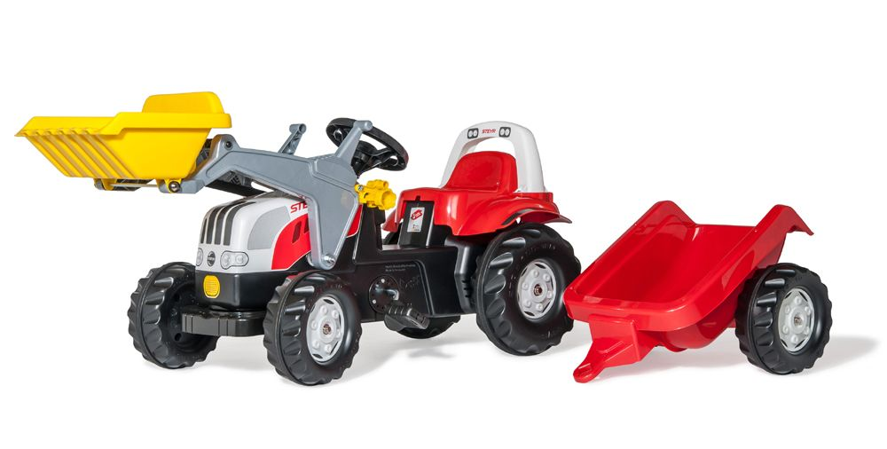 RollyKid Steyr traktori etukuormaajalla on täydellinen lelu pienimmille maanviljelijöille. Tällä polkuautotraktorilla lapset voivat kokea ohjaavansa omaa traktoriaan peltojen läpi. Etukuormaajalla he voivat lapata lunta tai siirtää hiekkaa ja maata.Traktori on suunniteltu hauskanpitoa ja turvallisuutta ajatellen. Se on varustettu suojatulla ketjulla, joka estää lasten jalkojen jäämisen puristuksiin. Lisäksi traktorin jäähdyttimen kansikin voidaan avata, jotta lapset voivat kurkistaa moottoritilaan, ja etukuormaajaa voidaan kallistaa kahvaa käyttämällä.Traktori on hyvän kokoinen, 161 x 47 x 55 cm, ja se painaa 9,6 kg, mikä tekee siitä vakaan ja helpon hallita lapsille. Se sopii 2,5–5-vuotiaille lapsille.RollyKid Steyr traktori etukuormaajalla on fantastinen lelu, joka tarjoaa lapsille tuntikausia hauskanpitoa. He voivat ajaa pihalla ympäri ja siirtää etukuormaajalla erilaisia asioita. Se on myös hyvä tapa stimuloida lasten mielikuvitusta ja luovuutta, kun he leikkivät omalla pienellä traktorillaan.