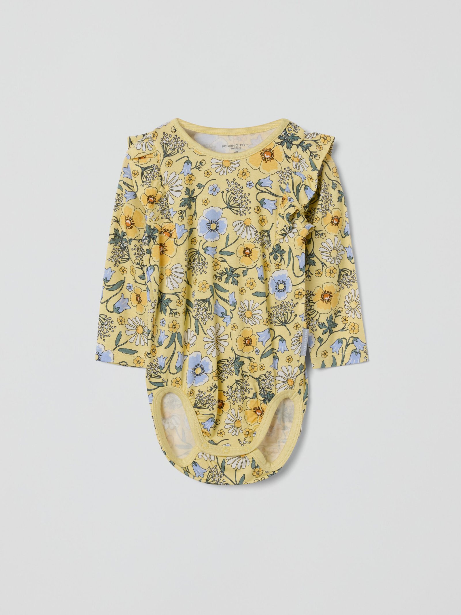 Kukkakuvioinen body ohutta ja vilpoisaa Ecovero™-viskoositrikoota – täydellinen lämpimiin päiviin. Bodyssa on olkapäillä pehmeät röyhelöt.