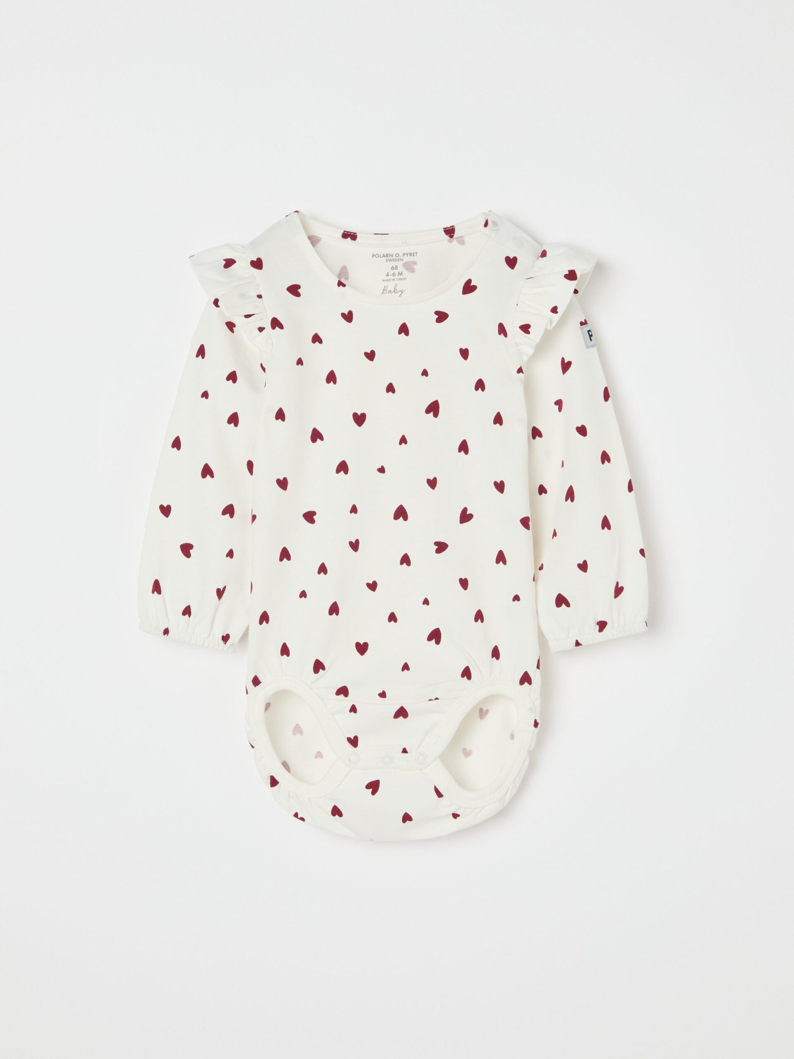 Body pehmeää luomupuuvillaa. Kuvioitu kokonaan sydänkuviolla. Bodyn etuosassa on röyhelöt, jotka jatkuvat olkapäiden yli. Joustavat hihansuut.